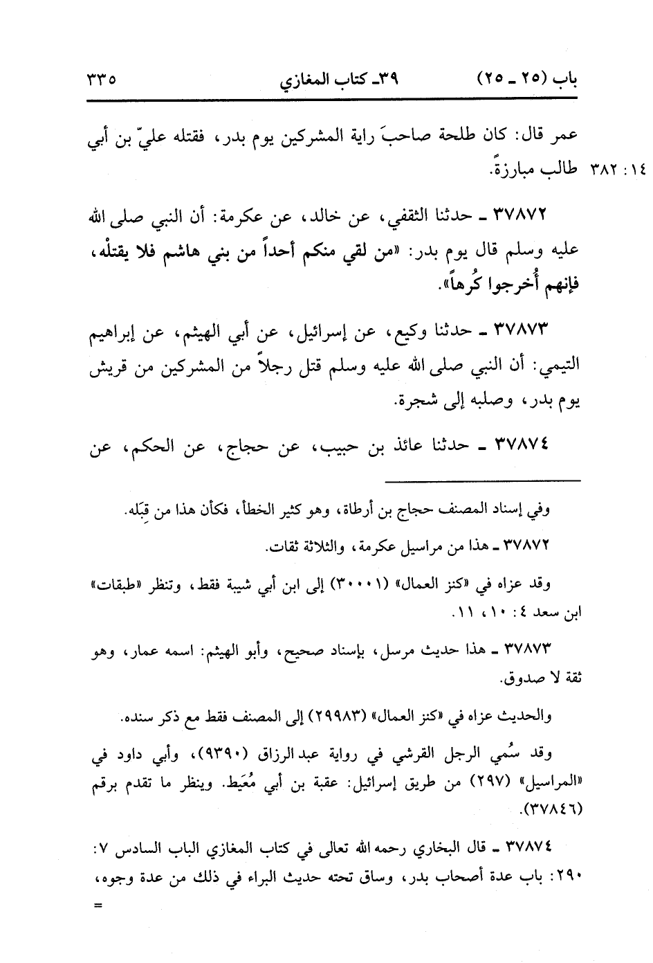 37873- حَدَّثَنَا وَكِيعٌ ، عَنْ إِسْرَائِيلَ ، عَنْ أَبِي الْهَيْثُمَّ ، قَالَ إِبْرَاهِيمُ التَّيْمِيُّ ؛ أَنَّ النَّبِيَّ صَلَّى الله عَلَيْهِ وَسَلَّمَ قَتَلَ رَجُلاً مِنَ الْمُشْرِكِينَ مِنْ قُرَيْشٍ يَوْمَ بَدْرٍ ، وَصَلَبَهُ إِلَى شَجَرَةٍ. (14/382).