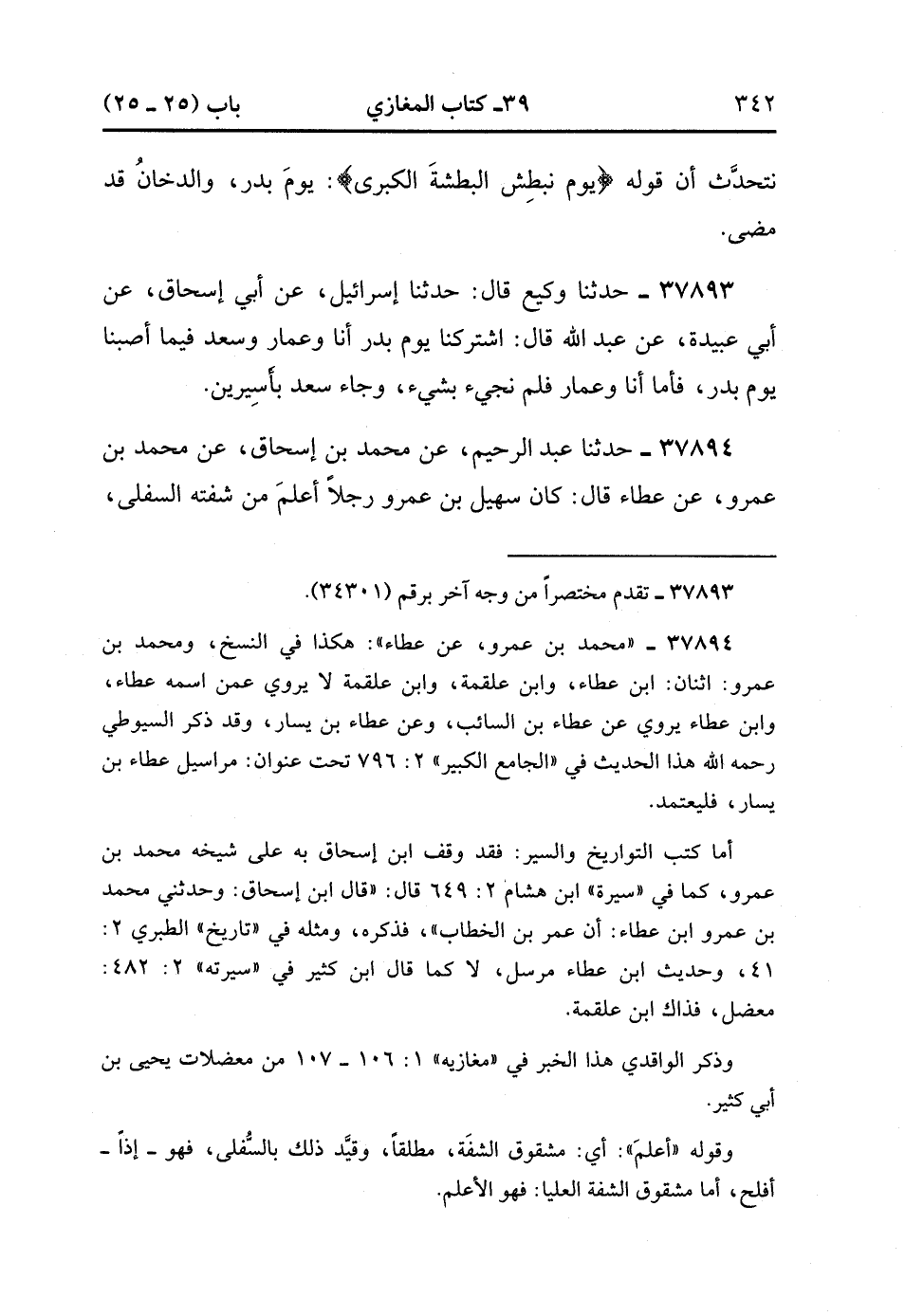 37894- حَدَّثَنَا عَبْدُ الرَّحِيمِ ، عَنْ مُحَمَّدِ بْنِ إِسْحَاقَ ، عَنْ مُحَمَّدِ بْنِ عَمْرٍو ، عَنْ عَطَاءٍ ، قَالَ : كَانَ سُهَيْلُ بْنُ عَمْرٍو رَجُلاً أَعْلَمَ مِنْ شَفَتِهِ السُّفْلَى ، فَقَالَ عُمَرُ بْنُ الْخَطَّابِ لِرَسُولِ اللهِ صَلَّى الله عَلَيْهِ وَسَلَّمَ يَوْمَ أُسِرَ بِبَدْرٍ : يَا رَسُولَ اللهِ ، اِنْزَعْ ثَنِيَّتَيْهِ السُّفْلَيَيْنِ فَيُدْلَعَ لِسَانُهُ ، فَلاَ يَقُومَ عَلَيْك خَطِيبًا بِمَوْطِنٍ أَبَدًا ، فَقَالَ : لاَ أُمَثِّلُ ، فَيُمَثِّلَ اللَّهُ بِي. (14/387).