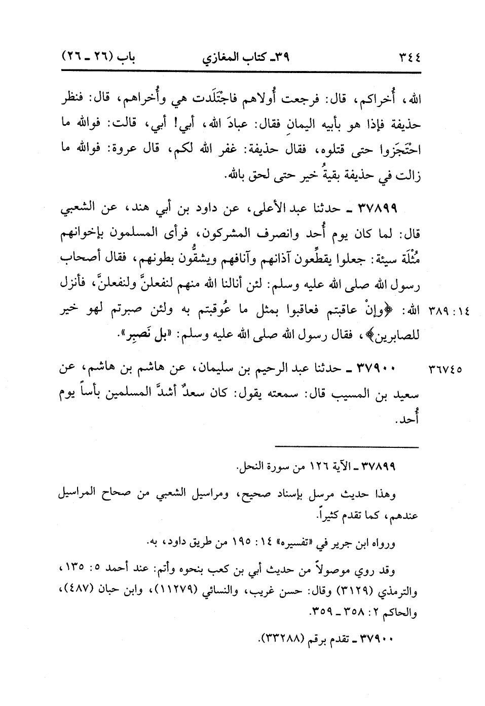 37899- حَدَّثَنَا عَبْدُ الأَعْلَى ، عَنْ دَاوُدَ بْنِ أَبِي هِنْدٍ ، عَنِ الشَّعْبِيِّ ، قَالَ : لَمَّا كَانَ يَوْمُ أُحُدٍ وَانْصَرَفَ الْمُشْرِكُونَ ، فَرَأَى الْمُسْلِمُونَ بِإِخْوَانِهِمْ مُثْلَةً سَيِّئَةً ، جَعَلُوا يَقْطَعُونَ آذَانَهُمْ وَآنَافَهُمْ ، وَيَشُقُّونَ بُطُونَهُمْ ، فَقَالَ أَصْحَابُ رَسُولِ اللهِ صَلَّى الله عَلَيْهِ وَسَلَّمَ : لَئِنْ أَنَالَنَا اللَّهُ مِنْهُمْ لَنَفْعَلَنَّ وَلَنَفْعَلَنَّ ، فَأَنْزَلَ اللَّهُ : {وَإِنْ عَاقَبْتُمْ فَعَاقِبُوا بِمِثْلِ مَا عُوقِبْتُمْ بِهِ ، وَلَئِنْ صَبَرْتُمْ لَهُوَ خَيْرٌ لِلصَّابِرِينَ} ، فَقَالَ رَسُولُ اللهِ صَلَّى الله عَلَيْهِ وَسَلَّمَ : بَلْ نَصْبِرُ.