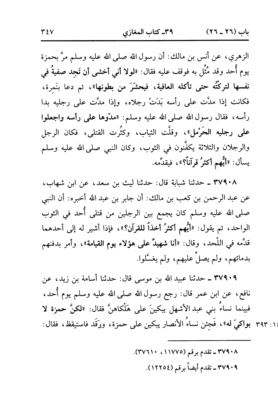 37907- حَدَّثَنَا زَيْدُ بْنُ الْحُبَابِ ، عَنْ أُسَامَةَ بْنِ زَيْدٍ ، قَالَ : حَدَّثَنَا الزُّهْرِيُّ ، عَنْ أَنَسِ بْنِ مَالِكٍ ؛ أَنَّ رَسُولَ اللهِ صَلَّى الله عَلَيْهِ وَسَلَّمَ مَرَّ بِحَمْزَةَ يَوْمَ أُحُدٍ وَقَدْ مُثِّلَ بِهِ ، فَوَقَفَ عَلَيْهِ ، فَقَالَ : لَوْلاَ أَنِّي أَخْشَى أَنْ تَجِدَ صَفِيَّةُ فِي نَفْسِهَا ؛ لَتَرَكْتُهُ حَتَّى تَأْكُلَهُ الْعَافِيَةُ ، فَيُحْشَرَ مِنْ بُطُونِهَا ، ثُمَّ دَعَا بِنَمِرَةٍ ، فَكَانَتْ إِذَا مُدَّتْ عَلَى رَأْسِهِ بَدَتْ رِجْلاَهُ ، وَإِذَا مُدَّتْ عَلَى رِجْلَيْهِ بَدَا رَأْسُهُ ، فَقَالَ رَسُولُ اللهِ صَلَّى الله عَلَيْهِ وَسَلَّمَ : مُدُّوهَا عَلَى رَأْسِهِ ، وَاجْعَلُوا عَلَى رِجْلَيْهِ الْحَرْمَلَ ، وَقَلَّتِ الثِّيَابُ ، وَكَثُرَتِ الْقَتْلَى ، فَكَانَ الرَّجُلُ وَالرَّجُلاَنِ وَالثَّلاَثَةُ يُكَفَّنُونَ فِي الثَّوْبِ ، وَكَانَ النَّبِيُّ صَلَّى الله عَلَيْهِ وَسَلَّمَ يَسْأَلُ أَيُّهُمْ أَكْثَرُ قُرْآنًا ، فَيُقَدِّمُهُ. (14/391)