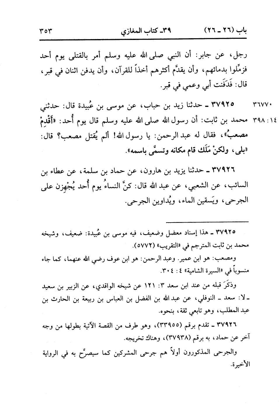 37926- حَدَّثَنَا يَزِيدُ بْنُ هَارُونَ ، عَنْ حَمَّادِ بْنِ سَلَمَةَ ، عَنْ عَطَاءِ بْنِ السَّائِبِ ، عَنِ الشَّعْبِيِّ ، عَنْ عَبْدِ اللهِ ، قَالَ : كُنَّ النِّسَاءُ يَوْمَ أُحُدٍ يُجْهِزْنَ عَلَى الْجَرْحَى ، وَيَسْقِينَ الْمَاءَ ، وَيُدَاوِينَ الْجَرْحَى. (14/398).