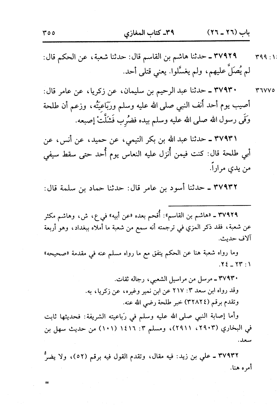 37930- حَدَّثَنَا عَبْدُ الرَّحِيمِ بْنُ سُلَيْمَانَ ، عَنْ زَكَرِيَّا ، عَنْ عَامِرٍ ، قَالَ : أُصِيبَ يَوْمَ أُحُدٍ أَنْفُ النَّبِيِّ صَلَّى الله عَلَيْهِ وَسَلَّمَ وَرَبَاعِيَتُهُ ، وَزَعَمَ أَنَّ طَلْحَةَ وَقَى رَسُولَ اللهِ صَلَّى الله عَلَيْهِ وَسَلَّمَ بِيَدِهِ ، فَضُرِبَ فَشَلَّتْ إِصْبَعَهُ.