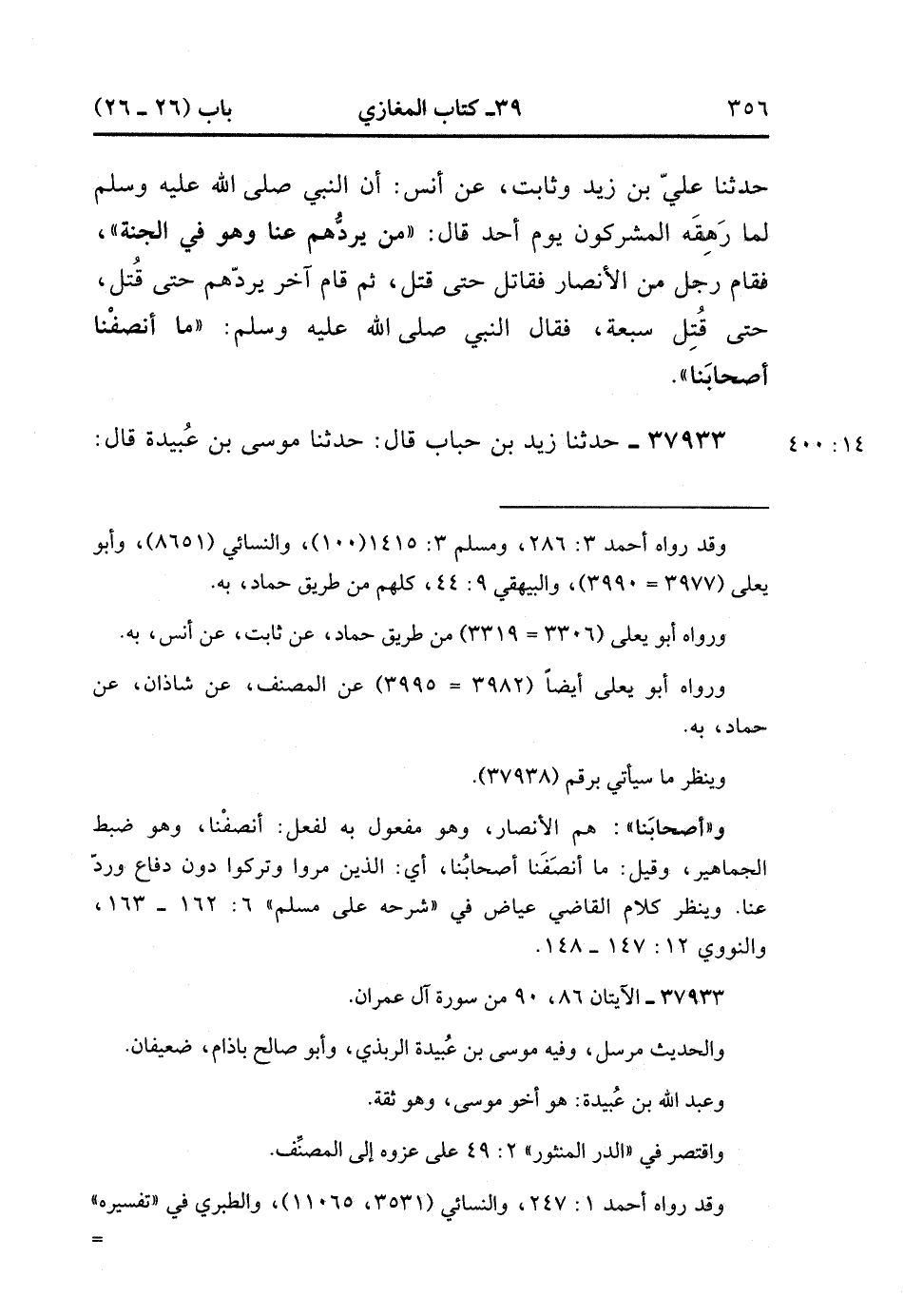 37932- حَدَّثَنَا أَسْوَدُ بْنُ عَامِرٍ , قَالَ : حدَّثَنَا حَمَّادُ بْنُ سَلَمَةَ ، قَالَ : حَدَّثَنَا عَلِيُّ بْنُ زَيْدٍ ، وَثَابِتٌ ، عَنْ أَنَسٍ ؛ أَنَّ النَّبِيَّ صَلَّى الله عَلَيْهِ وَسَلَّمَ لَمَّا رَهِقَهُ الْمُشْرِكُونَ يَوْمَ أُحُدٍ ، قَالَ : مَنْ يَرُدُّهُمْ عَنَّا وَهُوَ فِي الْجَنَّةِ ، فَقَامَ رَجُلٌ مِنَ الأَنْصَارِ فَقَاتَلَ حَتَّى قُتِلَ ، ثُمَّ قَامَ آخَرُ يَرُدُّهُمْ حَتَّى قُتِلَ حَتَّى قُتِلَ سَبْعَةٌ ، فَقَالَ النَّبِيُّ صَلَّى الله عَلَيْهِ وَسَلَّمَ : مَا أَنْصَفْنَا أَصْحَابَنَا. (14/399).