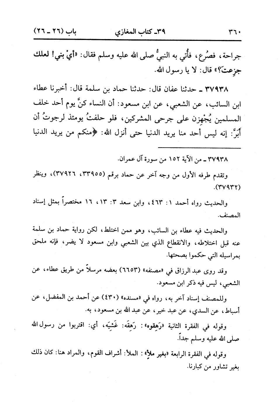 37938- حَدَّثَنَا عَفَّانُ , قَالَ : حدَّثَنَا حَمَّادُ بْنُ سَلَمَةَ , قَالَ : أَخْبَرَنَا عَطَاءُ بْنُ السَّائِبِ ، عَنِ الشَّعْبِيِّ ، عَنِ ابْنِ مَسْعُودٍ ؛ أَنَّ النِّسَاءَ كُنَّ يَوْمَ أُحُدٍ خَلْفَ الْمُسْلِمِينَ ، يُجْهِزْنَ عَلَى جَرْحَى الْمُشْرِكِينَ ، فَلَوْ حَلَفْتُ يَوْمَئِذٍ لَرَجَوْتُ أَنْ أَبَرَّ ، أَنَّهُ لَيْسَ أَحَدٌ مِنَّا يُرِيدُ الدُّنْيَا حَتَّى أَنْزَلَ اللَّهُ : {مِنْكُمْ مَنْ يُرِيدُ الدُّنْيَا وَمِنْكُمْ مَنْ يُرِيدُ الآخِرَةَ ثُمَّ صَرَفَكُمْ عَنْهُمْ لِيَبْتَلِيَكُمْ}.