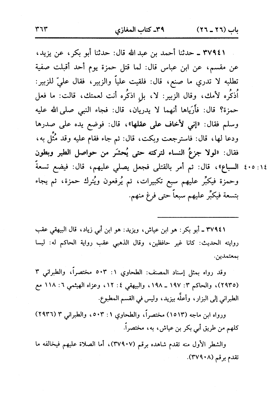 37941- حَدَّثَنَا أَحْمَدُ بْنُ عَبْدِ اللهِ , قَالَ : حدَّثَنَا أَبُو بَكْرٍ ، عَنْ يَزِيدَ ، عَنْ مِقْسَمٍ ، عَنِ ابْنِ عَبَّاسٍ ، قَالَ : لَمَّا قُتِلَ حَمْزَةُ يَوْمَ أُحُدٍ ، أَقْبَلَتْ صَفِيَّةُ تَطْلُبُهُ ، لاَ تَدْرِي مَا صَنَعَ ، قَالَ : فَلَقِيَتْ عَلِيًّا ، وَالزُّبَيْرَ ، فَقَالَ عَلِيٌّ لِلزُّبَيْرِ : اذْكُرْهُ لأُمِّكَ ، وَقَالَ الزُّبَيْرُ : لاَ ، بَلَ اذْكُرْهُ أَنْتَ لِعَمَّتِكَ ، قَالَتْ : مَا فَعَلَ حَمْزَةُ ؟ قَالَ : فَأَرَيَاهَا أَنَّهُمَا لاَ يَدْرِيَانِ ، قَالَ : فَجَاءَ النَّبِيُّ صَلَّى الله عَلَيْهِ وَسَلَّمَ ، فَقَالَ : إِنِّي لأَخَافُ عَلَى عَقْلِهَا ، قَالَ : فَوَضَعَ يَدَهُ عَلَى صَدْرِهَا ، وَدَعَا لَهَا ، قَالَ : فَاسْتَرْجَعَتْ وَبَكَتْ ، قَالَ : ثُمَّ جَاءَ فَقَامَ عَلَيْهِ ، وَقَدْ مُثِّلَ بِهِ ، فَقَالَ : لَوْلاَ جَزَعُ النِّسَاءِ لَتَرَكْتُهُ حَتَّى يُحْشَرَ مِنْ حَوَاصِلِ الطَّيْرِ وَبُطُونِ السِّبَاعِ ، قَالَ : ثُمَّ أَمَرَ بِالْقَتْلَى فَجَعَلَ يُصَلِّي عَلَيْهِمْ ، قَالَ : فَيَضَعُ تِسْعَةً وَحَمْزَةَ ، فَيُكَبِّرُ عَلَيْهِمْ سَبْعَ تَكْبِيرَاتٍ ، ثُمَّ يُرْفَعُونَ وَيُتْرَكُ حَمْزَةُ ، ثُمَّ يُجَاءُ بِتِسْعَةٍ ، فَيُكَبِّرُ عَلَيْهِمْ سَبْعًا حَتَّى فَرَغَ مِنْهُمْ. (14/404).