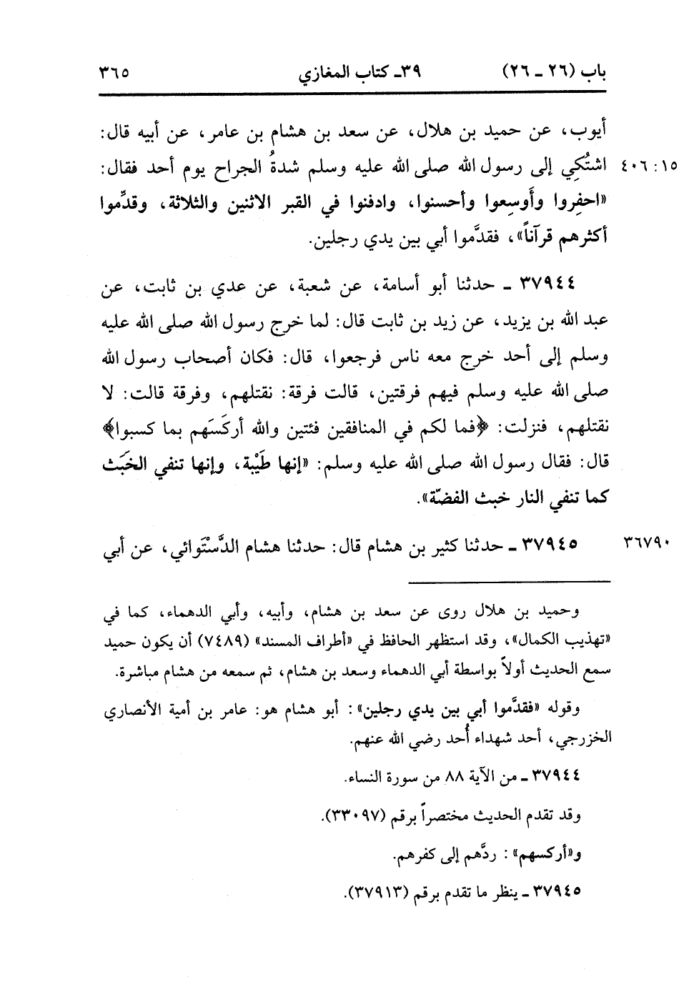 37944- حَدَّثَنَا أَبُو أُسَامَةَ ، عَنْ شُعْبَةَ ، عَنْ عَدِيِّ بْنِ ثَابِتٍ ، عَنْ عَبْدِ اللهِ بْنِ يَزِيدَ ، عَنْ زَيْدِ بْنِ ثَابِتٍ ، قَالَ : لَمَّا خَرَجَ رَسُولُ اللهِ صَلَّى الله عَلَيْهِ وَسَلَّمَ إِلَى أُحُدٍ ، خَرَجَ مَعَهُ نَاسٌ ، فَرَجَعُوا ، قَالَ : فَكَانَ أَصْحَابُ رَسُولِ اللهِ صَلَّى الله عَلَيْهِ وَسَلَّمَ فِيهِمْ فِرْقَتَيْنِ ؛ قَالَتْ فِرْقَةٌ : نَقْتُلُهُمْ , وَفِرْقَةٌ قَالَتْ : لاَ نَقْتُلُهُمْ , فَنَزَلَتْ : {فَمَا لَكُمْ فِي الْمُنَافِقِينَ فِئَتَيْنِ وَاللَّهُ أَرْكَسَهُمْ بِمَا كَسَبُوا} قَالَ : فَقَالَ رَسُولُ اللهِ صَلَّى الله عَلَيْهِ وَسَلَّمَ : إِنَّهَا طَيْبَةُ ، وَإِنَّهَا تَنْفِي الْخَبَثَ ، كَمَا تَنْفِي النَّارُ خَبَثَ الْفِضَّةِ.