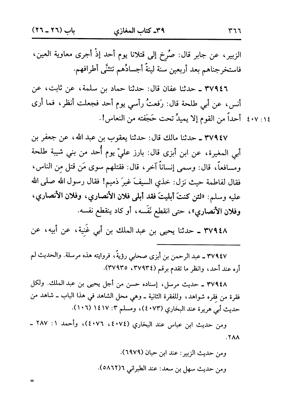 37947- حَدَّثَنَا مَالِكٌ , قَالَ : حدَّثَنَا يَعْقُوبُ بْنُ عَبْدِ اللهِ ، عَنْ جَعْفَرِ بْنِ أَبِي الْمُغِيرَةِ ، عَنِ ابْنِ أَبْزَى ، قَالَ : بَارَزَ عَلِيٌّ يَوْمَ أُحُدٍ مِنْ بَنِي شَيْبَةَ طَلْحَةَ وَمُسَافِعًا ، قَالَ : وَسَمَّى إِنْسَانًا آخَرَ ، قَالَ : فَقَتَلَهُمْ سِوَى مَنْ قَتَلَ مِنَ النَّاسِ ، فَقَالَ لِفَاطِمَةَ حَيْثُ نَزَلَ : خُذِي السَّيْفَ غَيْرَ ذَمِيمٍ ، فَقَالَ رَسُولُ اللهِ صَلَّى الله عَلَيْهِ وَسَلَّمَ : لَئِنْ كُنْتَ أَبْلَيْتَ ، فَقَدْ أَبْلَى فُلاَنٌ الأَنْصَارِيُّ ، وَفُلاَنٌ الأَنْصَارِيُّ ، وَفُلاَنٌ الأَنْصَارِيُّ حَتَّى انْقَطَعَ نَفَسُهُ ، أَوْ كَادَ يَنْقَطِعُ نَفَسُهُ.