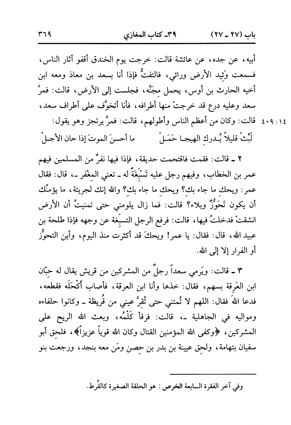 قَالَتْ : وَيَرْمِي سَعْدًا رَجُلٌ مِنَ الْمُشْرِكِينَ مِنْ قُرَيْشٍ يُقَالُ لَهُ : حِبَّانُ بْنُ الْعَرِقَةِ بِسَهْمٍ ، فَقَالَ : خُذْهَا وَأَنَا ابْنُ الْعَرِقَةِ ، فَأَصَابَ أَكْحَلَهُ فَقَطَعَهُ ، فَدَعَا اللَّهَ ، فَقَالَ : اللَّهُمَّ لاَ تُمِتْنِي حَتَّى تُقِرَّ عَيْنِي مِنْ قُرَيْظَةَ ، وَكَانُوا حُلَفَاءَهُ وَمَوَالِيَهُ فِي الْجَاهِلِيَّةِ ، قَالَتْ : فَرَقَأَ كَلْمُهُ ، وَبَعَثَ اللَّهُ الرِّيحَ عَلَى الْمُشْرِكِينَ : {وَكَفَى اللَّهُ الْمُؤْمِنِينَ الْقِتَالَ وَكَانَ اللَّهُ قَوِيًّا عَزِيزًا} فَلَحِقَ أَبُو سُفْيَانَ بِتِهَامَةَ ، وَلَحِقَ عُيَيْنَةُ بْنُ بَدْرِ بْنِ حِصْنٍ وَمَنْ مَعَهُ بِنَجْدٍ ، وَرَجَعَتْ بَنُو قُرَيْظَةَ فَتَحَصَّنُوا فِي صَيَاصِيهِمْ ، وَرَجَعَ رَسُولُ اللهِ صَلَّى الله عَلَيْهِ وَسَلَّمَ إِلَى الْمَدِينَةِ ، فَأَمَرَ بِقُبَّةٍ ، فَضُرِبَتْ عَلَى سَعْدٍ فِي الْمَسْجِدِ ، وَوُضِعَ السِّلاَحُ.