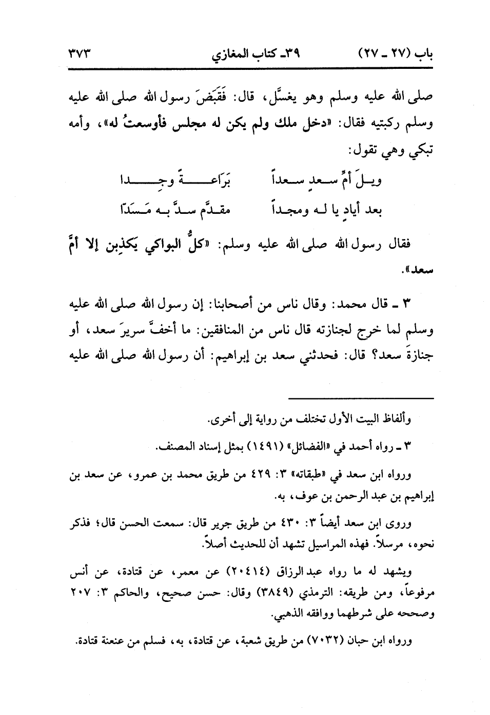 فَقَالَ رَسُولُ اللهِ صَلَّى الله عَلَيْهِ وَسَلَّمَ : كُلُّ الْبَوَاكِي يَكْذِبْنَ إِلاَّ أُمَّ سَعْدٍ ، قَالَ مُحَمَّدٌ : وَقَالَ نَاسٌ مِنْ أَصْحَابِنَا : إِنَّ رَسُولَ اللهِ صَلَّى الله عَلَيْهِ وَسَلَّمَ لَمَّا خَرَجَ لِجِنَازَتِهِ ، قَالَ نَاسٌ مِنَ الْمُنَافِقِينَ : مَا أَخَفَّ سَرِيرَ سَعْدٍ ، أَوْ جِنَازَةَ سَعْدٍ ؟ قَالَ : فَحَدَّثَنِي سَعْدُ بْنُ إِبْرَاهِيمَ ، أَنَّ رَسُولَ اللهِ صَلَّى الله عَلَيْهِ وَسَلَّمَ ، قَالَ يَوْمَ مَاتَ سَعْدٌ : لَقَدْ نَزَلَ سَبْعُونَ أَلْفَ مَلَكٍ شَهِدُوا جِنَازَةَ سَعْدٍ ، مَا وَطِئُوا الأَرْضَ قَبْلَ يَوْمَئِذٍ . (14/412).