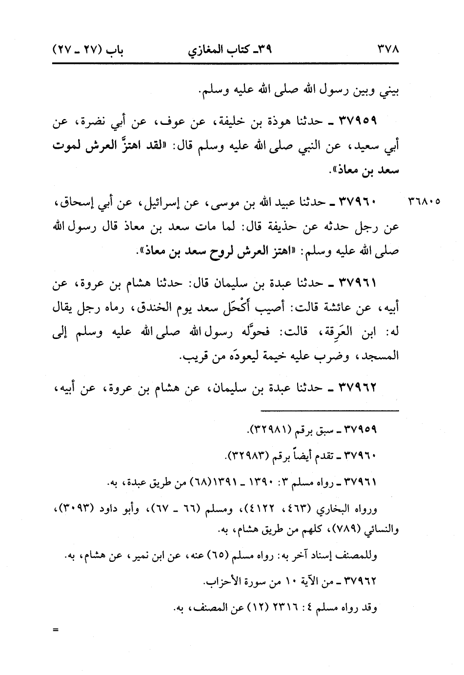 37959- حَدَّثَنَا هَوْذَةُ بْنُ خَلِيفَةَ ، عَنْ عَوْفٍ ، عَنْ أَبِي نَضْرَةَ ، عَنْ أَبِي سَعِيدٍ ، عَنِ النَّبِيِّ صَلَّى الله عَلَيْهِ وَسَلَّمَ ، قَالَ : اهْتَزَّ الْعَرْشُ لِمَوْتِ سَعْدِ بْنِ مُعَاذٍ.