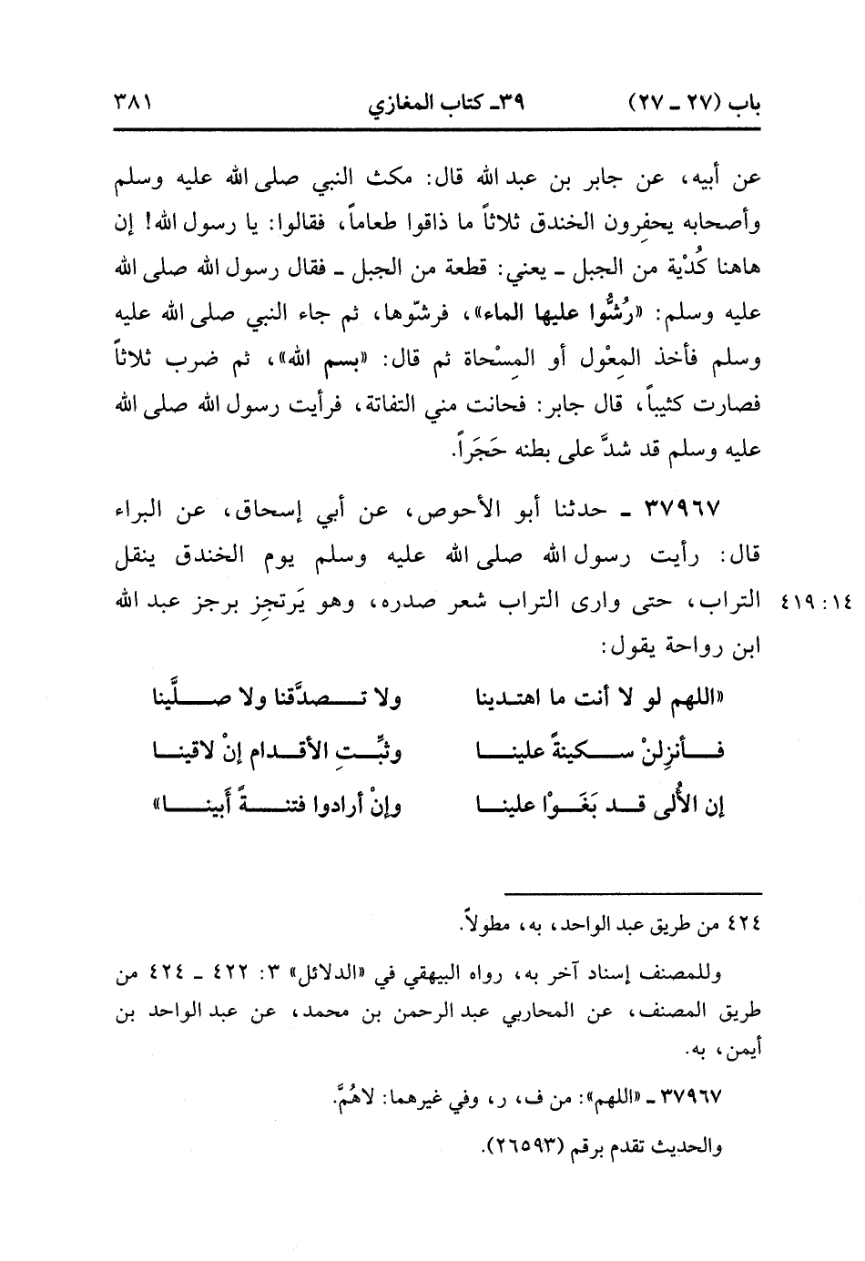 37966- حَدَّثَنَا وَكِيعُ بْنُ الْجَرَّاحِ , قَالَ : حدَّثَنَا عَبْدُ الْوَاحِدِ بْنُ أَيْمَنَ ، عَنْ أَبِيهِ ، عَنْ جَابِرِ بْنِ عَبْدِ اللهِ ، قَالَ : مَكَثَ النَّبِيُّ صَلَّى الله عَلَيْهِ وَسَلَّمَ وَأَصْحَابُهُ يَحْفِرُونَ الْخَنْدَقَ ثَلاَثًا ، مَا ذَاقُوا طَعَامًا ، فَقَالُوا : يَا رَسُولَ اللهِ ، إِنَّ هَاهُنَا كُدْيَةً مِنَ الْجَبَلِ ، يَعْنِي قِطْعَةً مِنَ الْجَبَلِ ، فَقَالَ رَسُولُ اللهِ صَلَّى الله عَلَيْهِ وَسَلَّمَ : رُشُّوا عَلَيْهَا الْمَاءَ ، فَرَشُّوهَا ، ثُمَّ جَاءَ النَّبِيُّ صَلَّى الله عَلَيْهِ وَسَلَّمَ فَأَخَذَ الْمِعْوَلَ ، أَوِ الْمِسْحَاةَ ، ثُمَّ قَالَ : بِسْمِ اللهِ ، ثُمَّ ضَرَبَ ثَلاَثًا فَصَارَتْ كَثِيبًا ، قَالَ جَابِرٌ : فَحَانَتْ مِنِّي الْتِفَاتَةٌ ، فَرَأَيْتُ رَسُولَ اللهِ صَلَّى الله عَلَيْهِ وَسَلَّمَ قَدْ شَدَّ عَلَى بَطْنِهِ حَجَرًا.