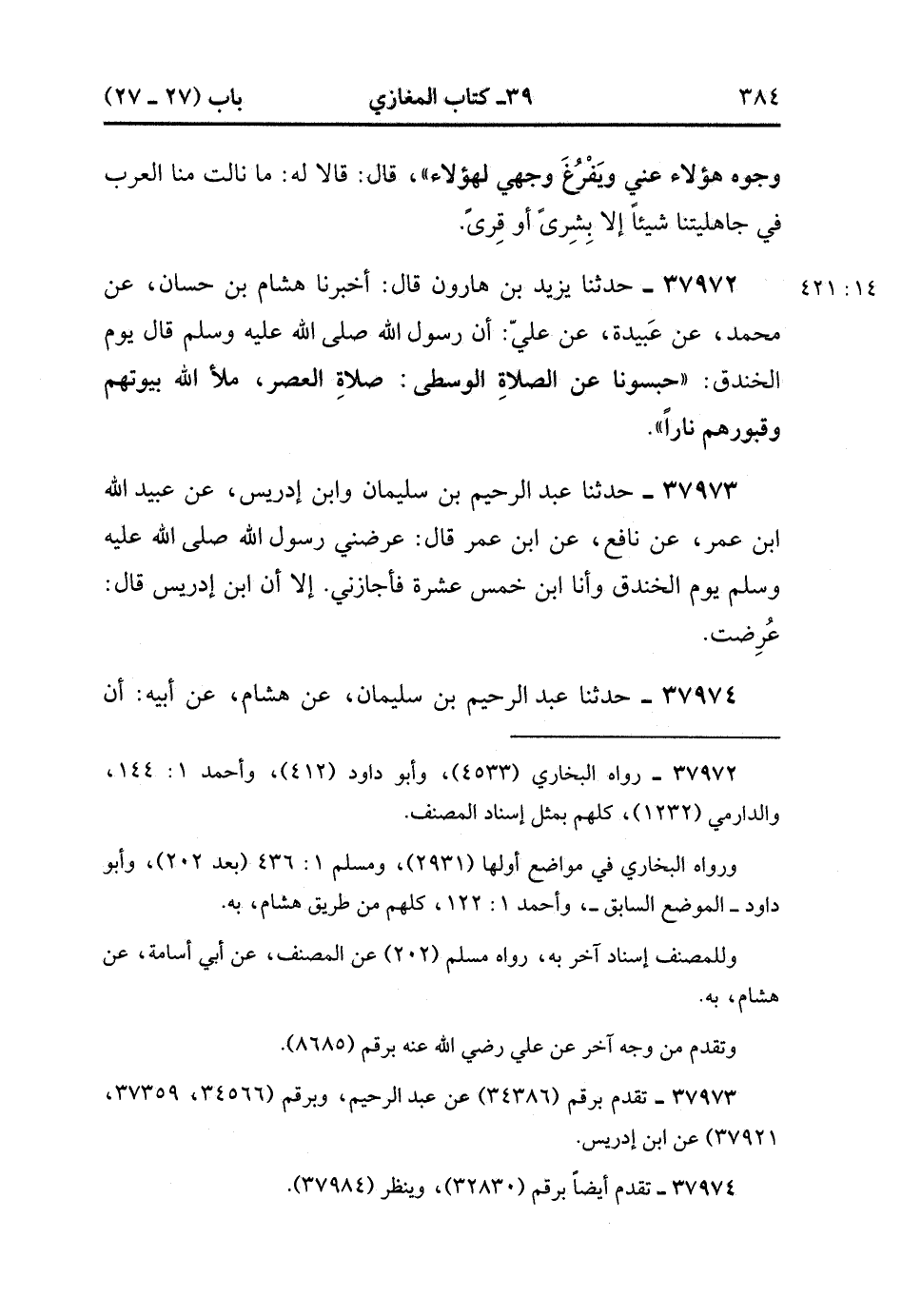 37973- حَدَّثَنَا عَبْدُ الرَّحِيمِ بْنُ سُلَيْمَانَ ، وَابْنُ إِدْرِيسَ ، عَنْ عُبَيْدِ اللهِ بْنِ عُمَرَ ، عَنْ نَافِعٍ ، عَنِ ابْنِ عُمَرَ ، قَالَ : عَرَضَنِي رَسُولُ اللهِ صَلَّى الله عَلَيْهِ وَسَلَّمَ يَوْمَ الْخَنْدَقِ وَأَنَا ابْنُ خَمْسَ عَشْرَةَ فَأَجَازَنِي . إِلاَّ أَنَّ ابْنَ إِدْرِيسَ قَالَ : عُرِضْتُ. (14/421).