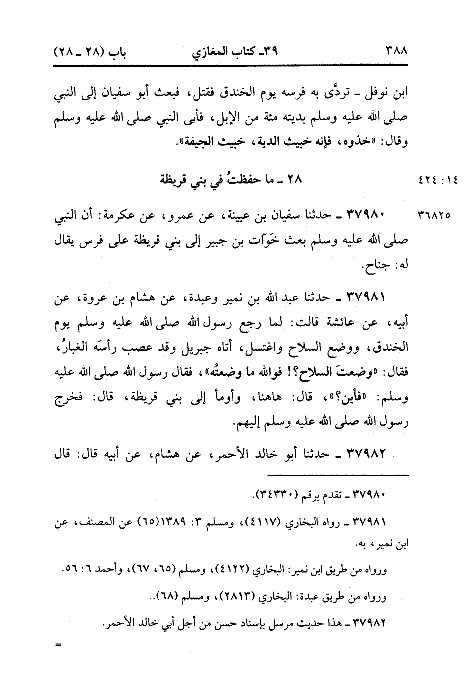 37981- حَدَّثَنَا عَبْدُ اللهِ بْنُ نُمَيْرٍ ، وَعَبْدَةُ ، عَنْ هِشَامِ بْنِ عُرْوَةَ ، عَنْ أَبِيهِ ، عَنْ عَائِشَةَ ، قَالَتْ : لَمَّا رَجَعَ رَسُولُ اللهِ صَلَّى الله عَلَيْهِ وَسَلَّمَ يَوْمَ الْخَنْدَقِ ، وَوَضَعَ السِّلاَحَ وَاغْتَسَلَ ، أَتَاهُ جِبْرِيلُ ، وَقَدْ عَصَبَ رَأْسَهُ الْغُبَارُ ، فَقَالَ : وَضَعْتَ السِّلاَحَ ؟ فَوَاللهِ مَا وَضَعْتُهُ ، فَقَالَ رَسُولُ اللهِ صَلَّى الله عَلَيْهِ وَسَلَّمَ : فَأَيْنَ ؟ قَالَ : هَاهُنَا ، وَأَوْمَأَ إِلَى بَنِي قُرَيْظَةَ ، قَالَ : فَخَرَجَ رَسُولُ اللهِ صَلَّى الله عَلَيْهِ وَسَلَّمَ إِلَيْهِمْ.