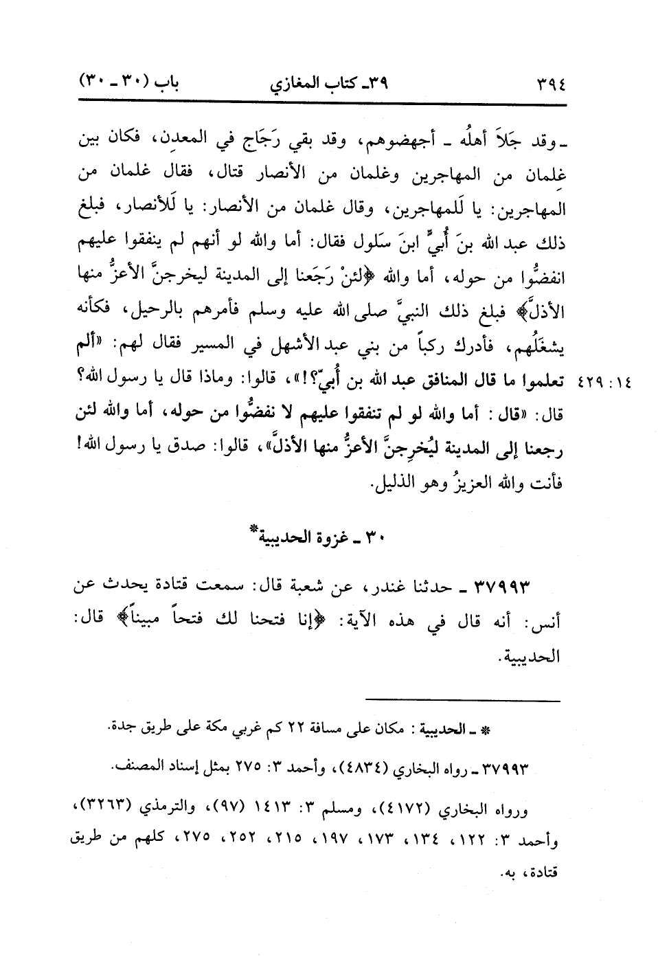 37993- حَدَّثَنَا غُنْدَرٌ ، عَنْ شُعْبَةَ ، قَالَ : سَمِعْتُ قَتَادَةَ يُحَدِّثُ ، عَنْ أَنَسٍ ؛ أَنَّهُ قَالَ فِي هَذِهِ الآيَةِ : {إنَّا فَتَحْنَا لَك فَتْحًا مُبِينًا} ، قَالَ : الْحُدَيْبِيَةُ. (14/429).