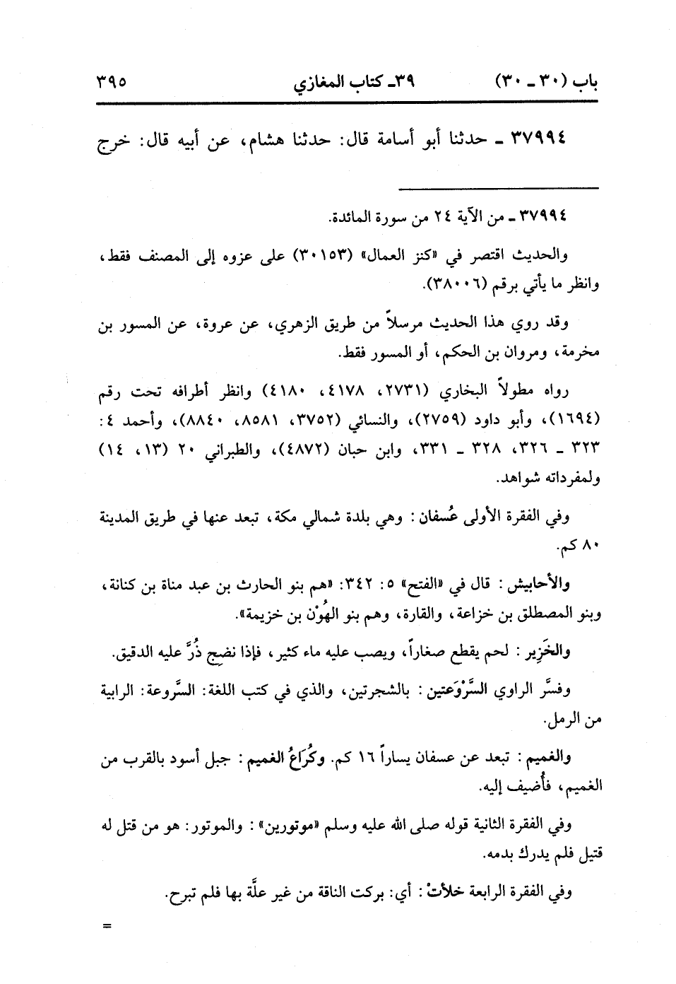 37994- حَدَّثَنَا أَبُو أُسَامَةَ , قَالَ : حدَّثَنَا هِشَامٌ ، عَنْ أَبِيهِ ، قَالَ : خَرَجَ رَسُولُ اللهِ صَلَّى الله عَلَيْهِ وَسَلَّمَ إِلَى الْحُدَيْبِيَةِ ، وَكَانَتِ الْحُدَيْبِيَةُ فِي شَوَّالٍ ، قَالَ : فَخَرَجَ رَسُولُ اللهِ صَلَّى الله عَلَيْهِ وَسَلَّمَ حَتَّى إِذَا كَانَ بِعُسْفَانَ ، لَقِيَهُ رَجُلٌ مِنْ بَنِي كَعْبٍ ، فَقَالَ : يَا رَسُولَ اللهِ ، إِنَّا تَرَكْنَا قُرَيْشًا وَقَدْ جَمَعَتْ لَكَ أَحَابِيشَهَا تُطْعِمُهَا الْخَزِيرَ ، يُرِيدُونَ أَنْ يَصُدُّوكَ عَنِ الْبَيْتِ ، فَخَرَجَ رَسُولُ اللهِ صَلَّى الله عَلَيْهِ وَسَلَّمَ حَتَّى إِذَا تَبَرَّزَ مِنْ عُسْفَانَ ، لَقِيَهُمْ خَالِدُ بْنُ الْوَلِيدِ طَلِيعَةً لِقُرَيْشٍ ، فَاسْتَقْبَلَهُمْ عَلَى الطَّرِيقِ ، فَقَالَ رَسُولُ اللهِ صَلَّى الله عَلَيْهِ وَسَلَّمَ : هَلُمَّ هَاهُنَا ، فَأَخَذَ بَيْنَ سَرْوَعَتَيْنِ ، يَعْنِي شَجَرَتَيْنِ ، وَمَالَ عَنْ سَنَنِ الطَّرِيقِ حَتَّى نَزَلَ الْغَمِيمَ.