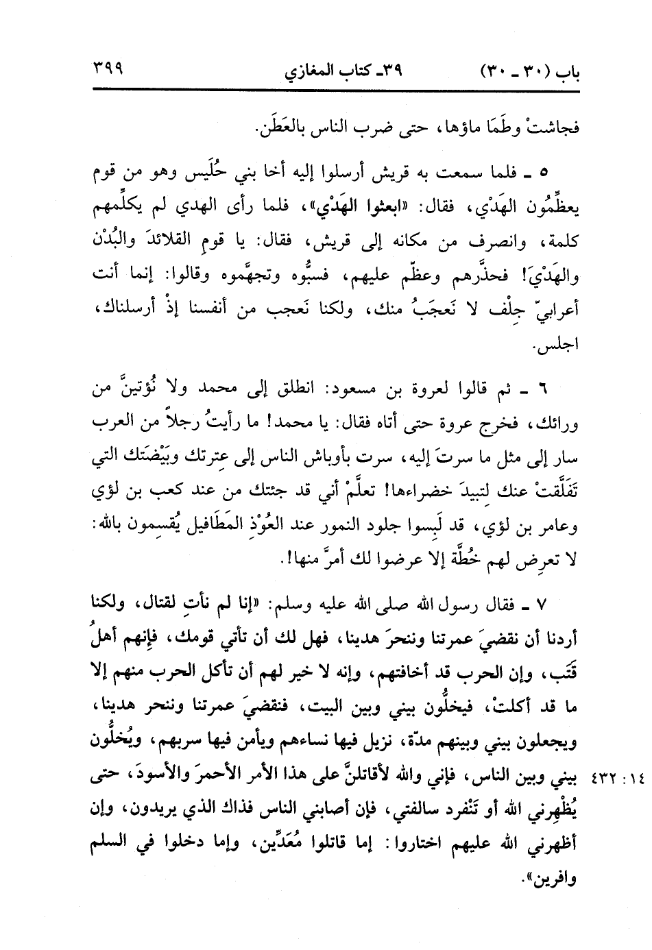 قَالَ : فَرَجَعَ عُرْوَةُ إِلَى قُرَيْشٍ ، فَقَالَ : تَعْلَمُنَّ وَاللهِ مَا عَلَى الأَرْضِ قَوْمٌ أَحَبُّ إِلَيَّ مِنْكُمْ ، إِنَّكُمْ لإِخْوَانِي وَأَحَبَّ النَّاسِ إِلَيَّ ، وَلَقَدَ اسْتَنْصَرْتُ لَكُمُ النَّاسَ فِي الْمَجَامِعِ ، فَلَمَّا لَمْ يَنْصُرُوكُمْ أَتَيْتُكُمْ بِأَهْلِي حَتَّى نَزَلْتُ مَعَكُمْ إِرَادَةَ أَنْ أُوَاسِيَكُمْ ، وَاللهِ مَا أُحِبُّ الْحَيَاةَ بَعْدَكُمْ ، تَعْلَمُنَّ أَنَّ الرَّجُلَ قَدْ عَرَضَ نِصْفًا فَاقْبَلُوهُ ، تَعْلَمُنَّ أَنِّي قَدْ قَدِمْتُ عَلَى الْمُلُوك ، وَرَأَيْتُ الْعُظَمَاءَ ، فَأُقْسِمُ بِاللهِ إِنْ رَأَيْتُ مَلِكًا ، وَلاَ عَظِيمًا أَعْظَمَ فِي أَصْحَابِهِ مِنْهُ ، إِنْ يَتَكَلَّمَ مِنْهُمْ رَجُلٌ حَتَّى يَسْتَأْذِنَهُ ، فَإِنْ هُوَ أَذِنَ لَهُ تَكَلَّمَ ، وَإِنْ لَمْ يَأْذَنْ لَهُ سَكَتَ ، ثُمَّ إِنَّهُ لَيَتَوَضَّأُ فَيَبْتَدِرُونَ وَضُوءَهُ يَصُبُّونَهُ عَلَى رُؤُوسِهِمْ ، يَتَّخِذُونَهُ حَنَانًا.