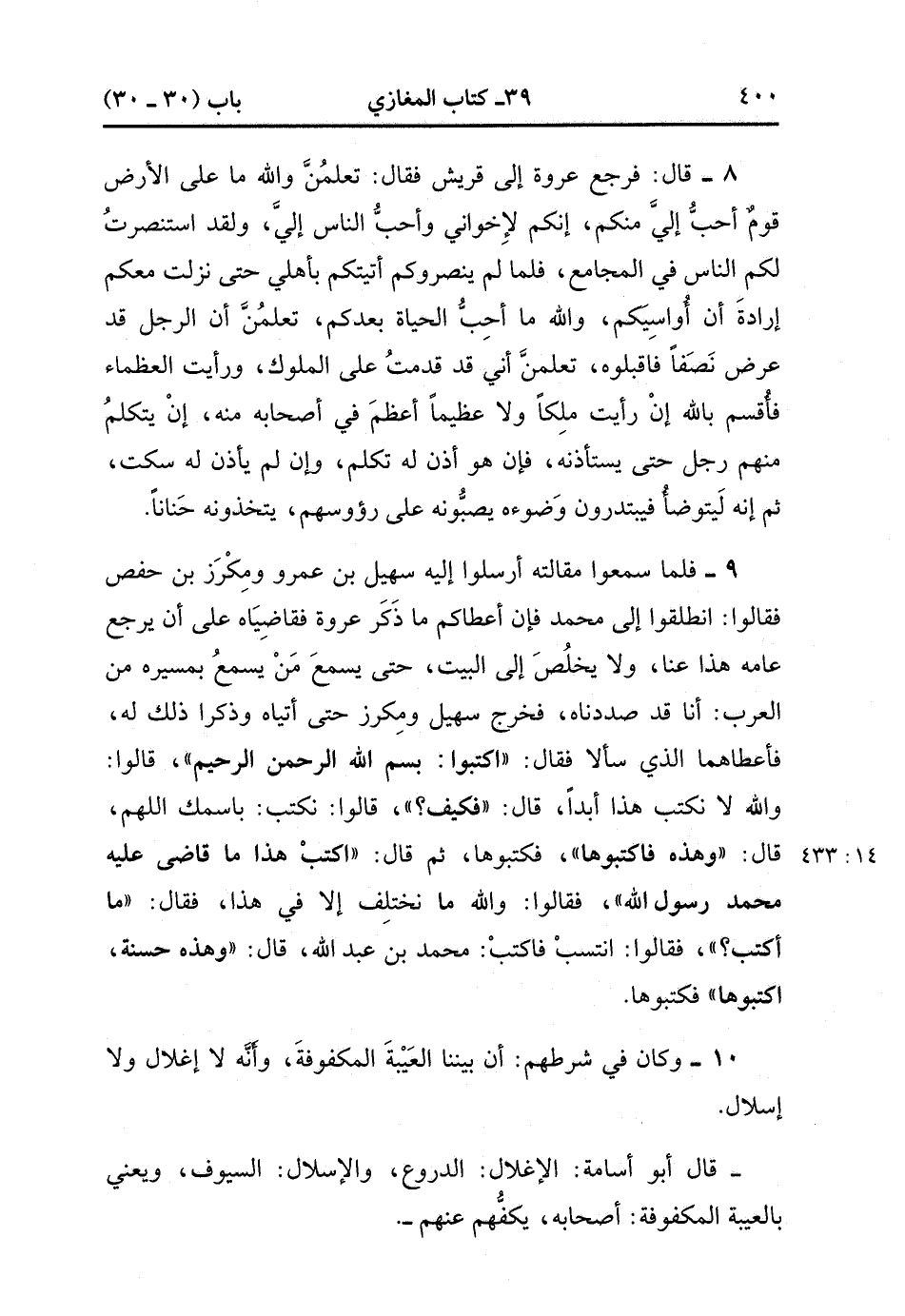 وَمِكْرَزٌ حَتَّى أَتَيَاهُ وَذَكَرَا ذَلِكَ لَهُ ، فَأَعْطَاهُمَا الَّذِي سَأَلاَ ، فَقَالَ : اكْتُبُوا : بِسْمِ اللهِ الرَّحْمَن الرَّحِيمِ ، قَالُوا : وَاللهِ لاَ نَكْتُبُ هَذَا أَبَدًا ، قَالَ : فَكَيْفَ ؟ قَالُوا : نَكْتُبُ بِاسْمِكَ اللَّهُمَّ ، قَالَ : وَهَذِهِ فَاكْتُبُوهَا ، فَكَتَبُوهَا ، ثُمَّ قَالَ : (14/432) اكْتُبْ : هَذَا مَا قَاضَى عَلَيْهِ مُحَمَّدٌ رَسُولُ اللهِ ، فَقَالُوا : وَاللهِ مَا نَخْتَلِفُ إِلاَّ فِي هَذَا ، فَقَالَ : مَا أَكْتُبُ ؟ فَقَالُوا : انْتَسِبْ ، فَاكْتُبْ مُحَمَّدُ بْنُ عَبْدِ اللهِ ، قَالَ : وَهَذِهِ حَسَنَةٌ ، اكْتُبُوهَا ، فَكَتَبُوهَا.