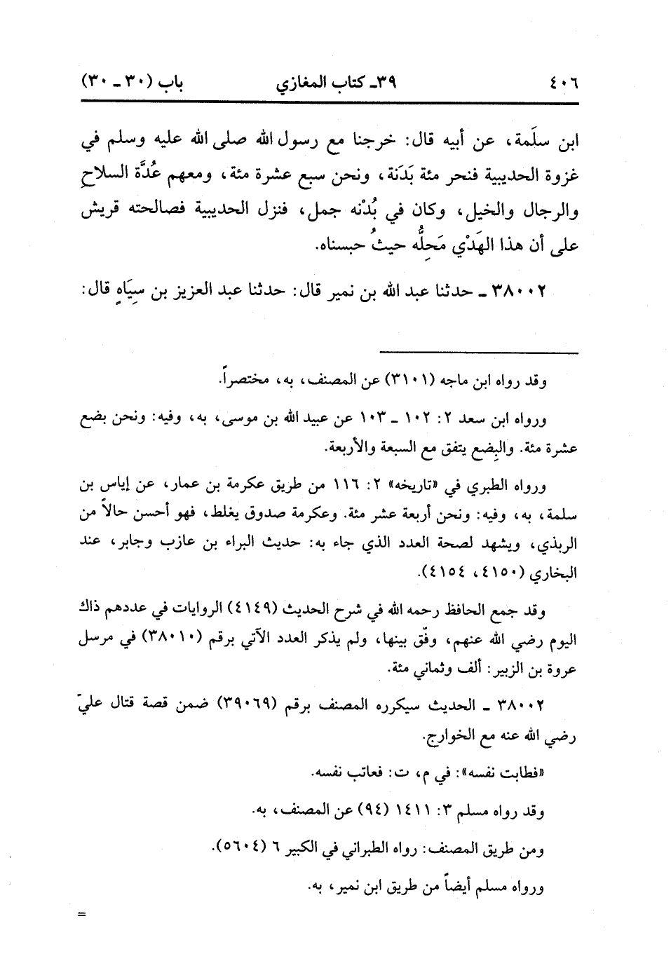 38001- حَدَّثَنَا عُبَيْدُ اللهِ بْنُ مُوسَى ، عَنْ مُوسَى بْنِ عُبَيْدَةَ ، عَنْ إِيَاسِ بْنِ سَلَمَةَ ، عَنْ أَبِيهِ ، قَالَ : خَرَجْنَا مَعَ رَسُولِ اللهِ صَلَّى الله عَلَيْهِ وَسَلَّمَ فِي غَزْوَةِ الْحُدَيْبِيَةِ ، فَنَحَرَ مِئَةَ بَدَنَةٍ ، وَنَحْنُ سَبْعَ عَشْرَةَ مِئَة ، وَمَعَهُمْ عِدَّةُ السِّلاَحِ وَالرِّجَالِ وَالْخَيْلِ ، وَكَانَ فِي بُدْنِهِ جَمَلٌ ، فَنَزَلَ الْحُدَيْبِيَةَ فَصَالَحَتُهُ قُرَيْشٌ عَلَى أَنَّ هَذَا الْهَدْيَ مَحَلُّهُ حَيْثُ حَبَسْنَاهُ. (14/438).