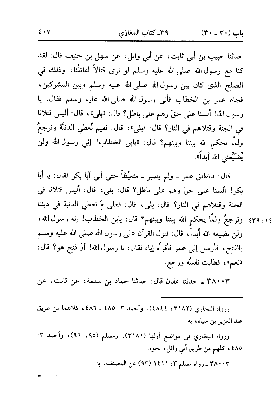 38002- حَدَّثَنَا عَبْدُ اللهِ بْنُ نُمَيْرٍ , قَالَ : حدَّثَنَا عَبْدُ الْعَزِيزِ بْنُ سِيَاهٍ ، قَالَ : حَدَّثَنَا حَبِيبُ بْنُ أَبِي ثَابِتٍ ، عَنْ أَبِي وَائِلٍ ، عَنْ سَهْلِ بْنِ حُنَيْفٍ ، قَالَ : لَقَدْ كُنَّا مَعَ رَسُولِ اللهِ صَلَّى الله عَلَيْهِ وَسَلَّمَ لَوْ نَرَى قِتَالاً لَقَاتَلْنَا ، وَذَلِكَ فِي الصُّلْحِ الَّذِي كَانَ بَيْنَ رَسُولِ اللهِ صَلَّى الله عَلَيْهِ وَسَلَّمَ وَبَيْنَ الْمُشْرِكِينَ ، فَجَاءَ عُمَرُ بْنُ الْخَطَّابِ فَأَتَى رَسُولَ اللهِ صَلَّى الله عَلَيْهِ وَسَلَّمَ ، فَقَالَ : يَا رَسُولَ اللهِ ، أَلَسْنَا عَلَى حَقٍّ وَهُمْ عَلَى بَاطِلٍ ؟ قَالَ : بَلَى ، قَالَ : أَلَيْسَ قَتْلاَنَا فِي الْجَنَّةِ وَقَتْلاَهُمْ فِي النَّارِ ؟ قَالَ : بَلَى ، قَالَ : فَفِيمَ نُعْطِي الدَّنِيَّةَ ، وَنَرْجِعُ وَلَمَّا يَحْكُمُ اللَّهُ بَيْنَنَا وَبَيْنَهُمْ ؟ قَالَ : يَابْنَ الْخَطَّابِ ، إِنِّي رَسُولُ اللهِ ، وَلَنْ يُضَيِّعَنِي اللَّهُ أَبَدًا ، قَالَ : فَانْطَلَقَ عُمَرُ ، وَلَمْ يَصْبِرْ ، مُتَغَيِّظًا حَتَّى أَتَى أَبَا بَكْرٍ ، فَقَالَ : يَا أَبَا بَكْرٍ ، أَلَسْنَا عَلَى حَقٍّ وَهُمْ عَلَى بَاطِلٍ ؟ قَالَ : بَلَى ، قَالَ : أَلَيْسَ قَتْلاَنَا فِي الْجَنَّةِ وَقَتْلاَهُمْ فِي النَّارِ ؟ قَالَ : بَلَى ، قَالَ : فَعَلَى مَ نُعْطِي الدَّنِيَّةَ فِي دِينِنَا ، وَنَرْجِعُ وَلَمَّا يَحْكُمُ اللَّهُ بَيْنَنَا (14/438) وَبَيْنَهُمْ ؟ قَالَ : يَابْنَ الْخَطَّابِ ، إِنَّهُ رَسُولُ اللهِ ، وَلَنْ يُضَيِّعَهُ اللَّهُ أَبَدًا ، قَالَ : فَنَزَلَ الْقُرْآنُ عَلَى رَسُولِ اللهِ صَلَّى الله عَلَيْهِ وَسَلَّمَ بِالْفَتْحِ ، فَأَرْسَلَ إِلَى عُمَرَ فَأَقْرَأَهُ إيَّاهُ ، فَقَالَ : يَا رَسُولَ اللهِ ، أَوَفَتْحٌ هُوَ ؟ قَالَ : نَعَمْ ، فَطَابَتْ نَفْسُهُ وَرَجَعَ. (14/439).