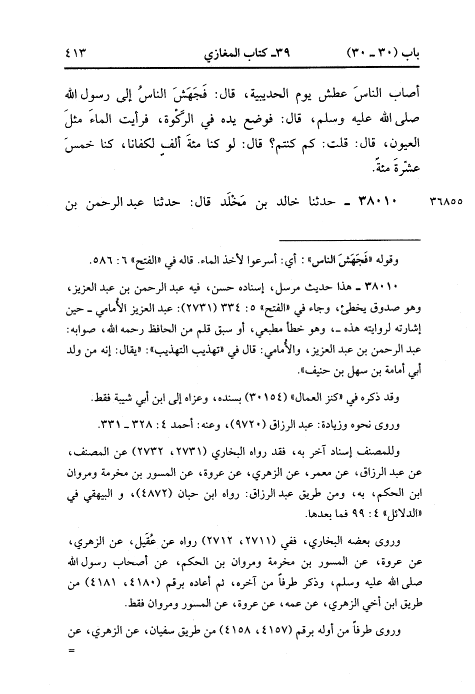 38009- حَدَّثَنَا ابْنُ إِدْرِيسَ ، عَنْ حُصَيْنٍ ، عَنْ سَالِمٍ ، عَنْ جَابِرٍ ، قَالَ : أَصَابَ النَّاسَ عَطَشٌ يَوْمَ الْحُدَيْبِيَةِ ، قَالَ : فَجَهَشَ النَّاسُ إِلَى رَسُولِ اللهِ صَلَّى الله عَلَيْهِ وَسَلَّمَ ، قَالَ : فَوَضَعَ يَدَهُ فِي الرَّكْوَةِ ، فَرَأَيْتُ الْمَاءَ مِثْلَ الْعُيُونِ ، قَالَ : قُلْتُ : كَمْ كُنْتُمْ ؟ قَالَ : لَوْ كُنَّا مِئَةَ أَلْفٍ لَكَفَانَا ، كُنَّا خَمْسَ عَشْرَةَ مِئَة. (14/444).