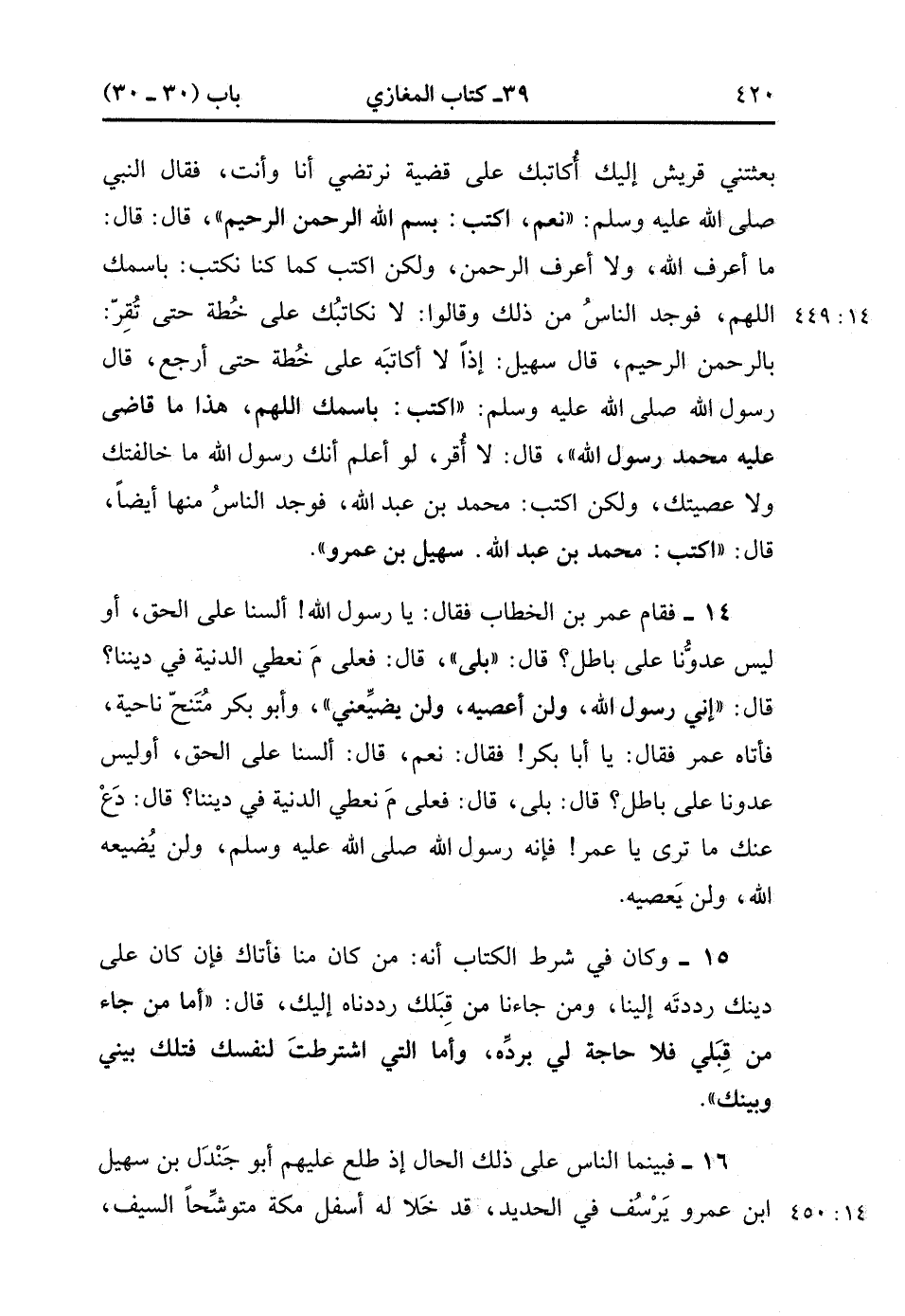 فَبَيْنَمَا النَّاسُ عَلَى ذَلِكَ الْحَالِ إِذْ طَلَعَ عَلَيْهِمْ أَبُو جَنْدَلِ بْنُ سُهَيْلِ بْنِ عَمْرٍو ، يَرْسُفُ فِي (14/449) الْحَدِيدِ ، قَدْ خَلاَ لَهُ أَسْفَلُ مَكَّةَ مُتَوَشِّحًا السَّيْفَ ، فَرَفَعَ سُهَيْلٌ رَأْسَهُ ، فَإِذَا هُوَ بِابْنِهِ أَبِي جَنْدَلٍ ، فَقَالَ : هَذَا أَوَّلُ مَنْ قَاضَيْتُكَ عَلَى رَدِّهِ ، فَقَالَ النَّبِيُّ صَلَّى الله عَلَيْهِ وَسَلَّمَ : يَا سُهَيْلُ ؛ إِنَّا لَمْ نَقْضِ الْكِتَابَ بَعْدُ ، قَالَ : وَلاَ أُكَاتِبُكَ عَلَى خُطَّةٍ حَتَّى تَرُدَّهُ ، قَالَ : فَشَأْنُكَ بِهِ ، قَالَ : فَبَهَشَ أَبُو جَنْدَلٍ إِلَى النَّاسِ ، فَقَالَ : يَا مَعْشَرَ الْمُسْلِمِينَ ، أُرَدُّ إِلَى الْمُشْرِكِينَ يَفْتِنُونَنِي فِي دِينِي ؟ فَلَصِقَ بِهِ عُمَرُ وَأَبُوهُ آخِذٌ بِيَدِهِ يَجْتَرُّهُ ، وَعُمَرُ يَقُولُ : إِنَّمَا هُوَ رَجُلٌ ، وَمَعَك السَّيْفُ ، فَانْطَلَقَ بِهِ أَبُوهُ.
