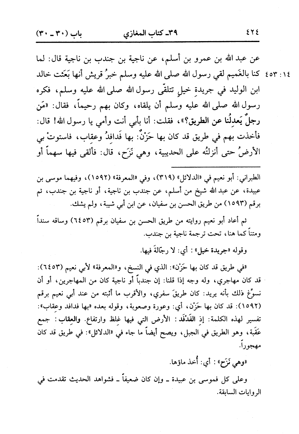 38015- حَدَّثَنَا عُبَيْدُ اللهِ بْنُ مُوسَى , قَالَ : أَخْبَرَنَا مُوسَى بْنُ عُبَيْدَةَ ، عَنْ عَبْدِ اللهِ بْنِ عَمْرِو بْنِ أَسْلَمَ ، عْن نَاجِيَةَ بْنِ جُنْدُبِ بْنِ نَاجِيَةَ ، قَالَ : لَمَّا كُنَّا بِالْغَمِيمِ لَقِيَ رَسُولُ اللهِ صَلَّى الله عَلَيْهِ وَسَلَّمَ خَبَرَ قُرَيْشٍ ، أَنَّهَا بَعَثَتْ خَالِدَ (14/452) بْنَ الْوَلِيدِ فِي جَرِيدَةِ خَيْلٍ ، تَتَلَقَّى رَسُولَ اللهِ صَلَّى الله عَلَيْهِ وَسَلَّمَ ، فَكَرِهَ رَسُولُ اللهِ صَلَّى الله عَلَيْهِ وَسَلَّمَ أَنْ يَلْقَاهُ ، وَكَانَ بِهِمْ رَحِيمًا ، فَقَالَ : مَنْ رَجُلٌ يَعْدِلُنَا عَنِ الطَّرِيقِ ؟ فَقُلْتُ : أَنَا ، بِأَبِي أَنْتَ وَأُمِّي يَا رَسُولَ اللهِ ، قَالَ : فَأَخَذْتُ بِهِمْ فِي طَرِيقٍ قَدْ كَانَ حَزْنٌ ؛ بِهَا فَدَافِدٌ وَعِقَابٌ ، فَاسْتَوَتْ بِي الأَرْضُ حَتَّى أَنْزَلْتُهُ عَلَى الْحُدَيْبِيَةِ ، وَهِيَ نَزَحٌ ، قَالَ : فَأَلْقَى فِيهَا سَهْمًا ، أَوْ سَهْمَيْنِ مِنْ كِنَانَتِهِ ، ثُمَّ بَصَقَ فِيهَا ، ثُمَّ دَعَا ، قَالَ : فَعَادَتْ عُيُونُهَا حَتَّى إِنِّي لأَقُولُ ، أَوْ نَقُولُ : لَوْ شِئْنَا لاَغْتَرَفْنَا بِأَقْدَاحِنَا. (14/453).