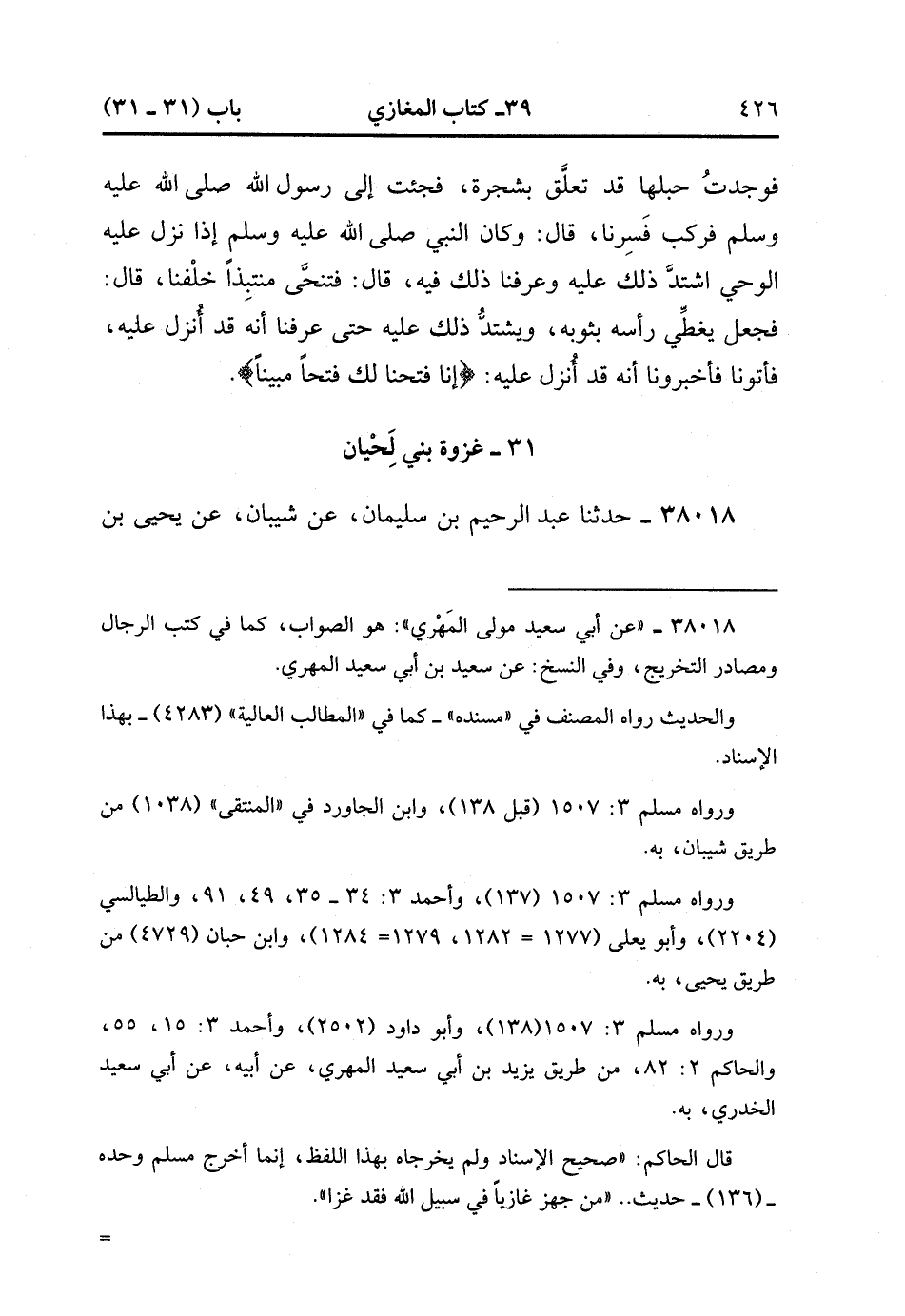 38018- حَدَّثَنَا عَبْدُ الرَّحِيمِ بْنُ سُلَيْمَانَ ، عَنْ شَيْبَانَ ، عَنْ يَحْيَى بْنِ أَبِي كَثِيرٍ ، عَنْ أَبِي سَعِيدٍ مَوْلَى الْمَهْرِيِّ ، أَنَّ أَبَا سَعِيدٍ أَخْبَرَهُ ؛ أَنَّ رَسُولَ اللهِ صَلَّى الله عَلَيْهِ وَسَلَّمَ ، قَالَ لَهُمْ فِي غَزْوَةٍ غَزَاهَا بَنِي لِحْيَانَ : لِيَنْبَعِثْ مِنْ كُلِّ رَجُلَيْنِ رَجُلٌ ، وَالأَجْرُ بَيْنَهُمَا. (14/454).