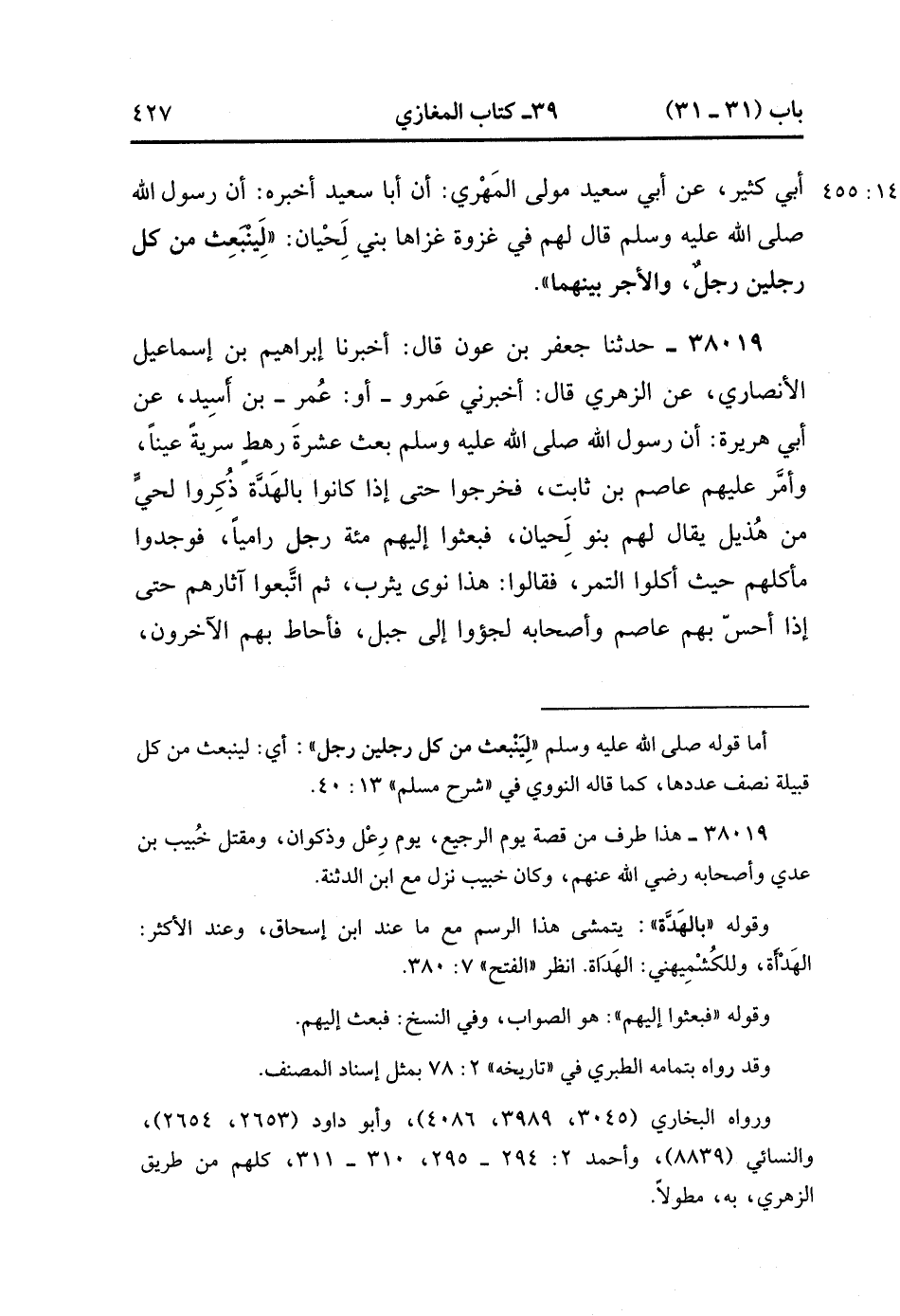 38019- حَدَّثَنَا جَعْفَرُ بْنُ عَوْنٍ , قَالَ : أَخْبَرَنَا إِبْرَاهِيمُ بْنُ إِسْمَاعِيلَ الأَنْصَارِيُّ ، عَنِ الزُّهْرِيِّ ، قَالَ : أَخْبَرَنِي عَمْرٌو ، أَوْ عُمَرُ بْنُ أُسَيْدَ ، عَنْ أَبِي هُرَيْرَةَ ؛ أَنَّ رَسُولَ اللهِ صَلَّى الله عَلَيْهِ وَسَلَّمَ بَعَثَ عَشْرَةَ رَهْطٍ سَرِيَّةً عَيْنًا ، وَأَمَّرَ عَلَيْهِمْ عَاصِمَ بْنَ ثَابِتٍ ، فَخَرَجُوا حَتَّى إِذَا كَانُوا بِالْهَدَّةِ ذُكِرُوا لِحَيٍّ مِنْ هُذَيْلٍ ، يُقَالُ لَهُمْ بَنُو لِحْيَانَ ، فَبَعَثَ إِلَيْهِمْ مِئَةَ رَجُلٍ رَامِيًا ، فَوَجَدُوا مَأْكَلَهُمْ حَيْثُ أَكَلُوا التَّمْرَ ، فَقَالُوا : هَذِا نَوَى يَثْرِبَ ، ثُمَّ اتَّبَعُوا آثَارَهُمْ ، حَتَّى إِذَا أَحَسَّ بِهِمْ عَاصِمٌ وَأَصْحَابُهُ لَجَؤُوا إِلَى جَبَلٍ ، فَأَحَاطَ بِهِمُ الآخَرُونَ ، فَاسْتَنْزَلُوهُمْ وَأَعْطَوْهُمَ الْعَهْدَ ، فَقَالَ عَاصِمٌ : وَاللهِ لاَ أَنْزِلُ عَلَى عَهْدِ كَافِرٍ ، اللَّهُمَّ أَخْبِرْ نَبِيَّك عَنَّا ، وَنَزَلَ إِلَيْهِ ابْنُ دَثِنَةَ الْبَيَاضِيُّ. (14/455).