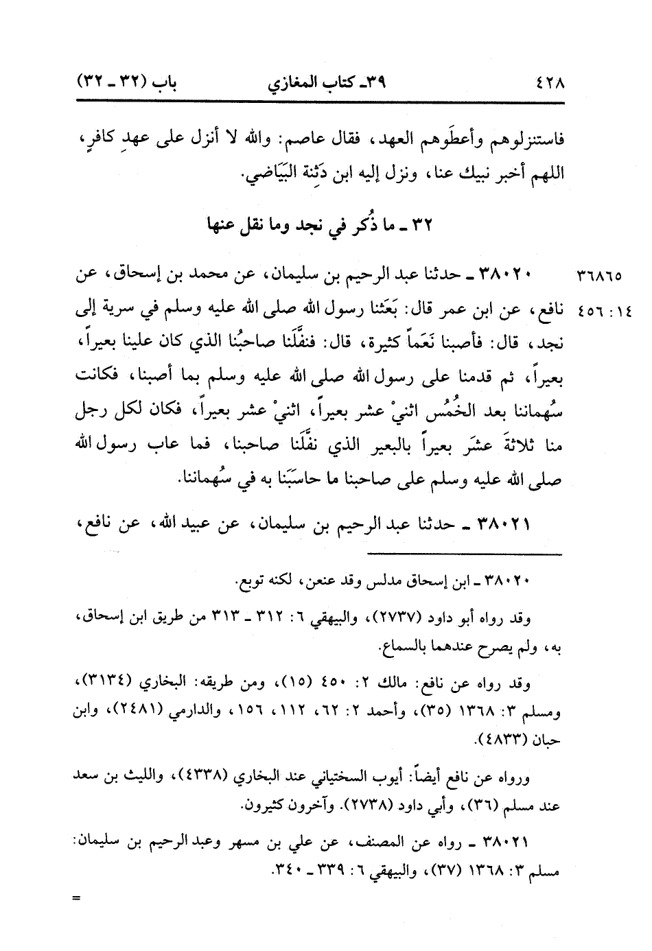 38020- حَدَّثَنَا عَبْدُ الرَّحِيمِ بْنُ سُلَيْمَانَ ، عَنْ مُحَمَّدِ بْنِ إِسْحَاقَ ، عَنْ نَافِعٍ ، عَنِ ابْنِ عُمَرَ ، قَالَ : بَعَثَنَا رَسُولُ اللهِ صَلَّى الله عَلَيْهِ وَسَلَّمَ فِي سَرِيَّةٍ إِلَى نَجْدٍ ، قَالَ : فَأَصَبْنَا نَعَمًا كَثِيرَةً ، قَالَ : فَنَفَّلَنَا صَاحِبُنَا الَّذِي كَانَ عَلَيْنَا بَعِيرًا بَعِيرًا ، ثُمَّ قَدِمْنَا عَلَى رَسُولِ اللهِ صَلَّى الله عَلَيْهِ وَسَلَّمَ بِمَا أَصَبْنَا ، فَكَانَتْ سُهْمَانُنَا بَعْدَ الْخُمُسِ اثْنَيْ عَشَرَ بَعِيرًا ، اثْنَيْ عَشَرَ بَعِيرًا ، فَكَانَ لِكُلِّ رَجُلٍ مِنَّا ثَلاَثَةَ عَشَرَ بَعِيرًا بِالْبَعِيرِ الَّذِي نَفَّلَنَا صَاحِبُنَا ، فَمَا عَابَ رَسُولُ اللهِ صَلَّى الله عَلَيْهِ وَسَلَّمَ عَلَى صَاحِبِنَا مَا حَاسَبَنَا بِهِ فِي سُهْمَانِنَا. (14/455).