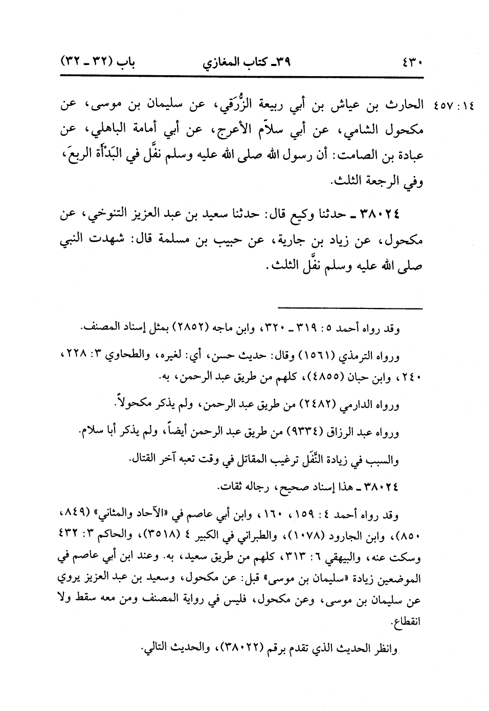38024- حَدَّثَنَا وَكِيعٌ , قَالَ : حدَّثَنَا سَعِيدُ بْنُ عَبْدِ الْعَزِيزِ التَّنُوخِيُّ ، عَنْ مَكْحُولٍ ، عَنْ زِيَادِ بْنِ جَارِيَةَ ، عَنْ حَبِيبِ بْنِ مَسْلَمَةَ ، قَالَ : شَهِدْتُ النَّبِيَّ صَلَّى الله عَلَيْهِ وَسَلَّمَ نَفَّلَ الثُّلُثَ. (14/457).