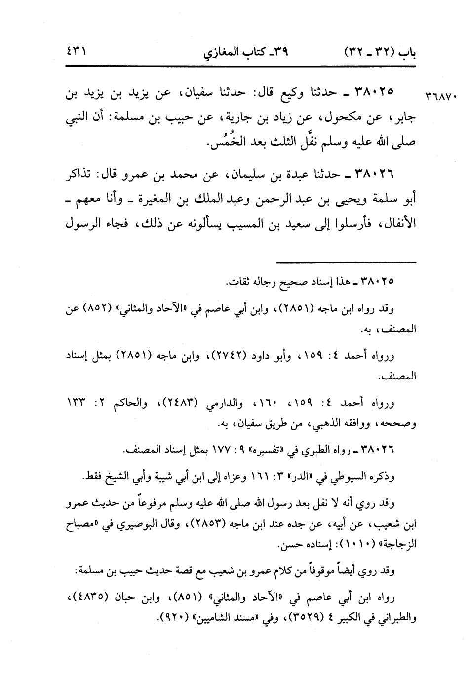 38025- حَدَّثَنَا وَكِيعٌ , قَالَ : حدَّثَنَا سُفْيَانُ ، عَنْ يَزِيدَ بْنِ يَزِيدَ بْنِ جَابِرٍ ، عَنْ مَكْحُولٍ ، عَنْ زِيَادِ بْنِ جَارِيَةَ ، عَنْ حَبِيبِ بْنِ مَسْلَمَةَ ؛ أَنَّ النَّبِيَّ صَلَّى الله عَلَيْهِ وَسَلَّمَ نَفَّلَ الثُّلُثَ بَعْدَ الْخُمُسِ.