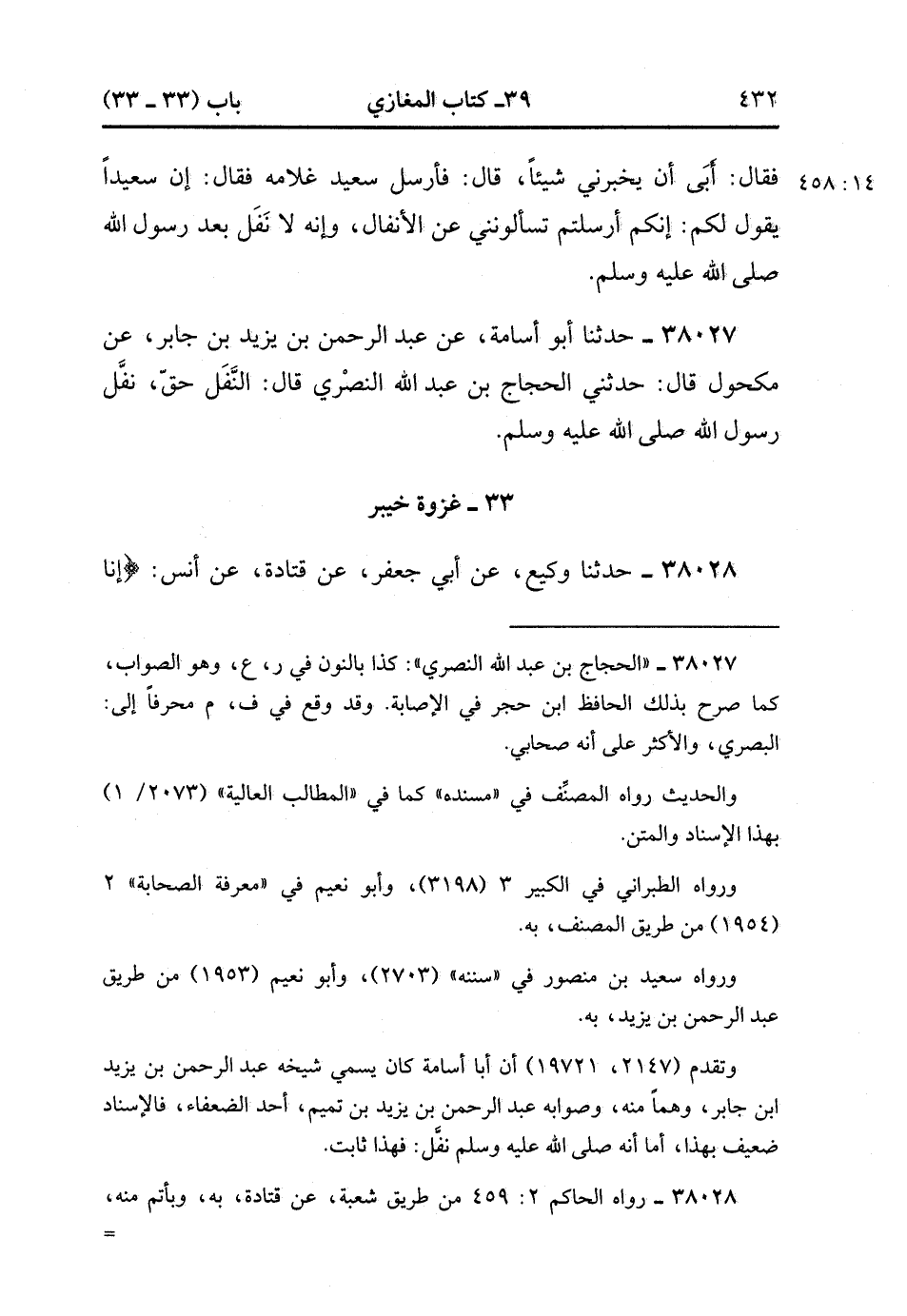 38027- حَدَّثَنَا أَبُو أُسَامَةَ ، عَنْ عَبْدِ الرَّحْمَنِ بْنِ يَزِيدَ بْنِ جَابِرٍ ، عَنْ مَكْحُولٍ ، قَالَ : حدَّثَنِي الْحَجَّاجُ بْنُ عَبْدِ اللهِ النَّصْرِيُّ ، قَالَ : النَّفَلُ حَقٌّ ، نَفَّلَ رَسُولُ اللهِ صَلَّى الله عَلَيْهِ وَسَلَّمَ. (14/458).