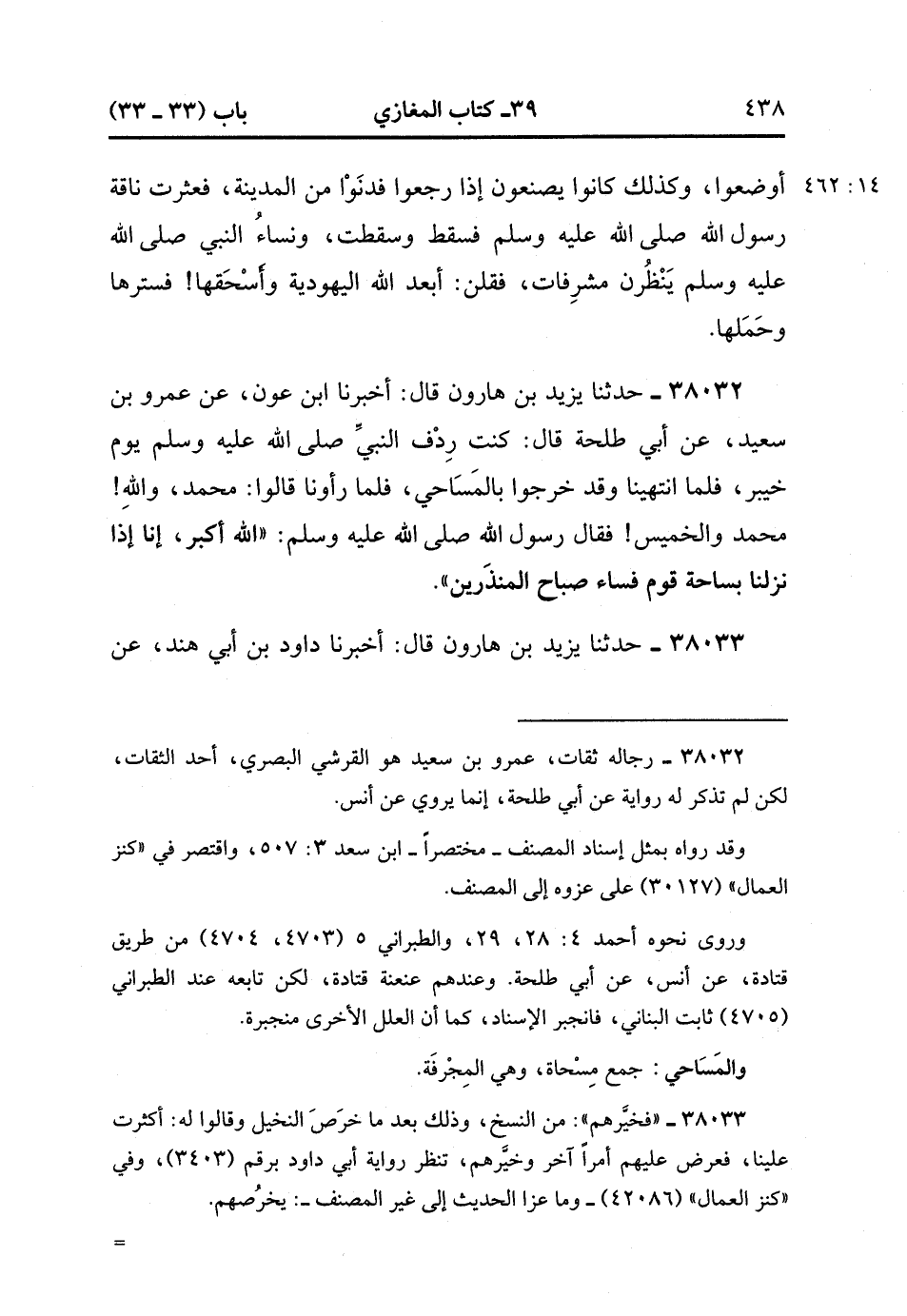 38032- حَدَّثَنَا يَزِيدُ بْنُ هَارُونَ , قَالَ : أَخْبَرَنَا ابْنُ عَوْنٍ ، عَنْ عَمْرِو بْنِ سَعِيدٍ ، عَنْ أَبِي طَلْحَةَ ، قَالَ : كُنْتُ رِدْفَ النَّبِيِّ صَلَّى الله عَلَيْهِ وَسَلَّمَ يَوْمَ خَيْبَرَ ، فَلَمَّا انْتَهَيْنَا وَقَدْ خَرَجُوا بِالْمَسَاحِي ، فَلَمَّا رَأَوْنَا ، قَالُوا : مُحَمَّدٌ وَاللهِ ، مُحَمَّدٌ وَالْخَمِيسُ ، فَقَالَ رَسُولُ اللهِ صَلَّى الله عَلَيْهِ وَسَلَّمَ : اللَّهُ أَكْبَرُ ، إِنَّا إِذَا نَزَلْنَا بِسَاحَةِ قَوْمٍ فَسَاءَ صَبَاحُ الْمُنْذَرِينَ.