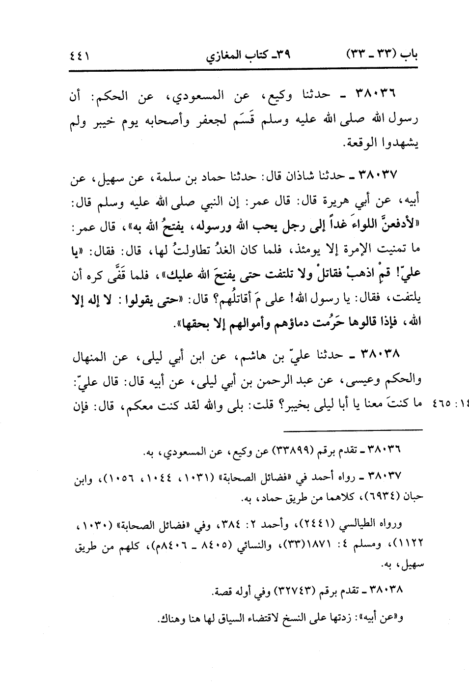 38037- حَدَّثَنَا شَاذَانُ , قَالَ : حدَّثَنَا حَمَّادُ بْنُ سَلَمَةَ ، عَنْ سُهَيْلٍ ، عَنْ أَبِيهِ ، عَنْ أَبِي هُرَيْرَةَ ، قَالَ : قَالَ عُمَرُ : إِنَّ النَّبِيَّ صَلَّى الله عَلَيْهِ وَسَلَّمَ ، قَالَ : لأَدْفَعَنِ اللِّوَاءَ غَدًا إِلَى رَجُلٍ يُحِبُّ اللَّهَ وَرَسُولَهُ ، يَفْتَحُ اللَّهُ بِهِ ، قَالَ عُمَرُ : مَا تَمَنَّيْت الإِمْرَةَ إِلاَّ يَوْمَئِذٍ ، فَلَمَّا كَانَ الْغَدُ تَطَاوَلْتُ لَهَا ، قَالَ : فَقَالَ : يَا عَلِيُّ ، قُمَ اذْهَبْ فَقَاتِلْ ، وَلاَ تَلْفِتْ حَتَّى يَفْتَحَ اللَّهُ عَلَيْك ، فَلَمَّا قَفَّى ، كَرِهَ أَنْ يَلْتَفِتَ ، فَقَالَ : يَا رَسُولَ اللهِ ، عَلاَمَ أُقَاتِلُهُمْ ؟ قَالَ : حَتَّى يَقُولُوا : لاَ إِلَهَ إِلاَّ اللَّهُ ، فَإِذَا قَالَوهَا حَرُمَتْ دِمَاؤُهُمْ وَأَمْوَالُهُمْ إِلاَّ بِحَقِّهَا. (14/464).