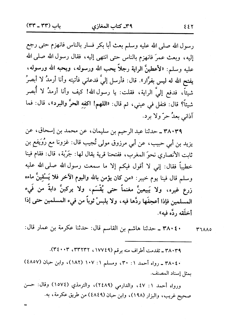 38038- حَدَّثَنَا عَلِيُّ بْنُ هَاشِمٍ ، عَنِ ابْنِ أَبِي لَيْلَى ، عَنِ الْمِنْهَالِ ، وَالْحَكَمِ ، وَعِيسَى ، عَنْ عَبْدِ الرَّحْمَنِ بْنِ أَبِي لَيْلَى ، عَنْ أَبِيهِ ، قَالَ : قَالَ عَلِيٌّ : مَا كُنْتُ مَعَنا يَا أَبَا لَيْلَى بِخَيْبَرَ ؟ قُلْتُ : بَلَى وَاللهِ ، (14/464) لَقَدْ كُنْت مَعَكُمْ ، قَالَ : فَإِنَّ رَسُولَ اللهِ صَلَّى الله عَلَيْهِ وَسَلَّمَ بَعَثَ أَبَا بَكْرٍ فَسَارَ بِالنَّاسِ ، فَانْهَزَمَ حَتَّى رَجَعَ إِلَيْهِ ، وَبَعَثَ عُمَرَ فَانْهَزَمَ بِالنَّاسِ حَتَّى انْتَهَى إِلَيْهِ ، فَقَالَ رَسُولُ اللهِ صَلَّى الله عَلَيْهِ وَسَلَّمَ : لأُعْطِيَنَّ الرَّايَةَ رَجُلاً يُحِبُّ اللَّهَ وَرَسُولَهُ ، وَيُحِبُّهُ اللَّهُ وَرَسُولُهُ ، يَفْتَحُ اللَّهُ لَهُ ، لَيْسَ بِفَرَّارٍ ، قَالَ : فَأَرْسَلَ إِلَيَّ فَدَعَانِي ، فَأَتَيْتُهُ وَأَنَا أَرْمَدُ لاَ أُبْصِرُ شَيْئًا ، فَدَفَعَ إِلَيَّ الرَّايَةَ ، فَقُلْتُ : يَا رَسُولَ اللهِ ، كَيْفَ وَأَنَا أَرْمَدُ لاَ أُبْصِرُ شَيْئًا ؟ قَالَ : فَتَفَلَ فِي عَيْنِي ، ثُمَّ قَالَ : اللَّهُمَ ، اكْفِهِ الْحَرَّ وَالْبَرْدَ ، قَالَ : فَمَا آذَانِي بَعْدُ حَرٌّ ، وَلاَ بَرْدٌ.