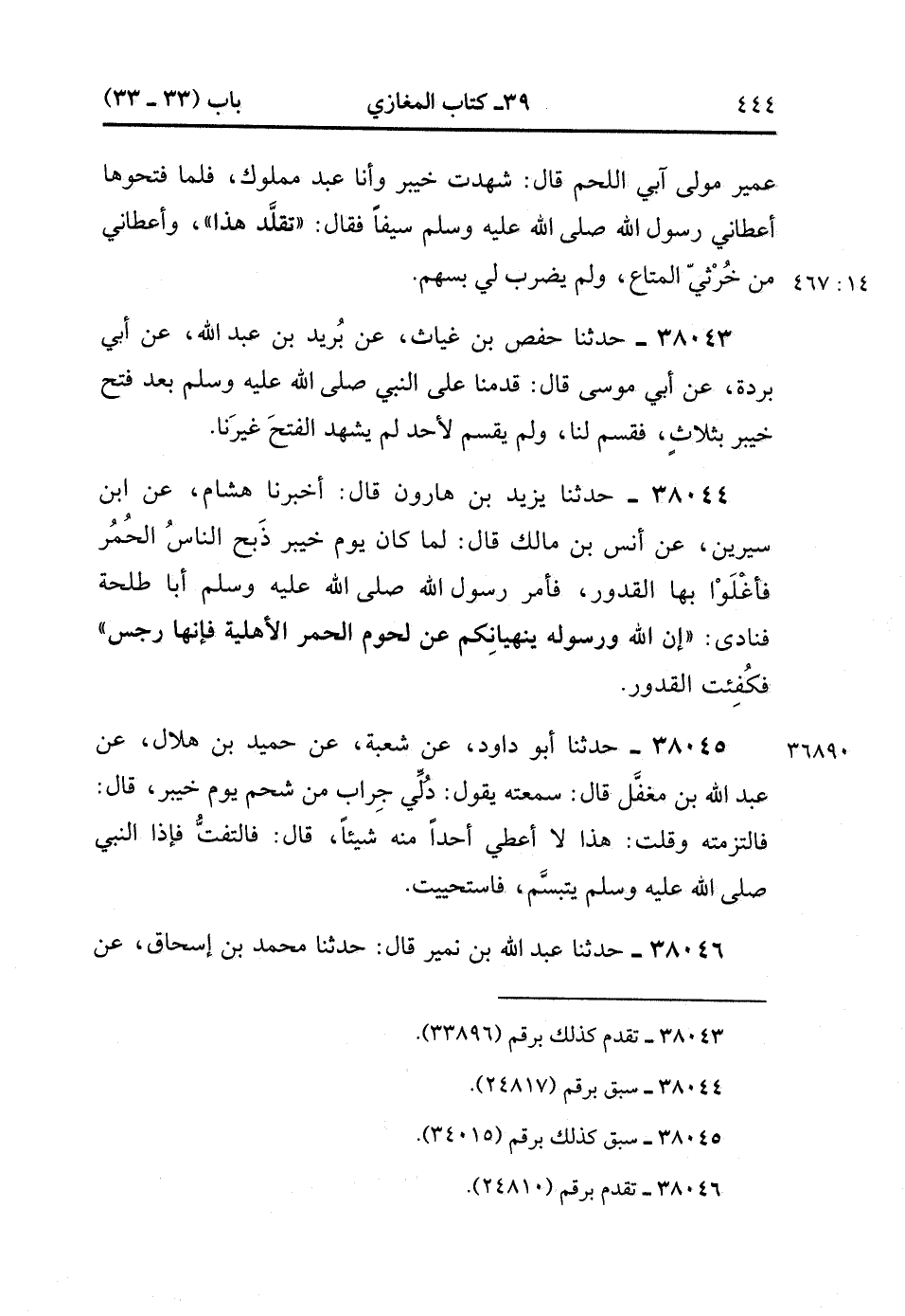 38042- حَدَّثَنَا حَفْصُ بْنُ غِيَاثٍ ، عَنْ مُحَمَّدِ بْنِ زَيْدٍ ، قَالَ : حدَّثَنِي عُمَيْرُ مَوْلَى آبِي اللَّحْمِ ، قَالَ : شَهِدْتُ خَيْبَرَ وَأَنَا عَبْدٌ مَمْلُوكٌ ، فَلَمَّا فَتَحُوهَا أَعْطَانِي رَسُولُ اللهِ صَلَّى الله عَلَيْهِ وَسَلَّمَ سَيْفًا ، فَقَالَ : تَقَلَّدْ هَذَا ، وَأَعْطَانِي مِنْ خُرْثِيِّ الْمَتَاعِ ، وَلَمْ يَضْرِبْ لِي بِسَهْمٍ. (14/466)