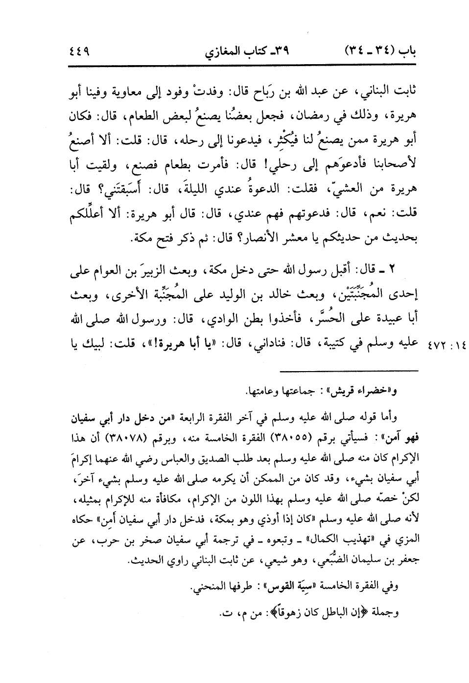قَالَ : أَقْبَلَ رَسُولُ اللهِ صَلَّى الله عَلَيْهِ وَسَلَّمَ حَتَّى دَخَلَ مَكَّةَ ، وَبَعَثَ الزُّبَيْرَ بْنَ الْعَوَّامِ عَلَى إِحْدَى الْمُجَنِّبَتَيْنِ ، وَبَعَثَ خَالِدَ بْنَ الْوَلِيدِ عَلَى الْمُجَنِّبَةِ الأُخْرَى ، وَبَعَثَ أَبَا عُبَيْدَةَ عَلَى الْحُسَّرِ ، فَأَخَذُوا بَطْنَ الْوَادِي ، قَالَ : وَرَسُولُ اللهِ صَلَّى الله عَلَيْهِ وَسَلَّمَ فِي (14/471) كَتِيبَةٍ ، قَالَ : فَنَادَانِي ، قَالَ : يَا أَبَا هُرَيْرَةَ ، قُلْتُ : لَبَّيْكَ يَا رَسُولَ اللهِ ، قَالَ : اهْتِفْ لِي بِالأَنْصَارِ ، وَلاَ يَأْتِنِي إِلاَّ أَنْصَارِيٌّ ، قَالَ : فَهَتَفْتُ بِهِمْ ، قَالَ : فَجَاؤُوا حَتَّى أَطَافُوا بِهِ.