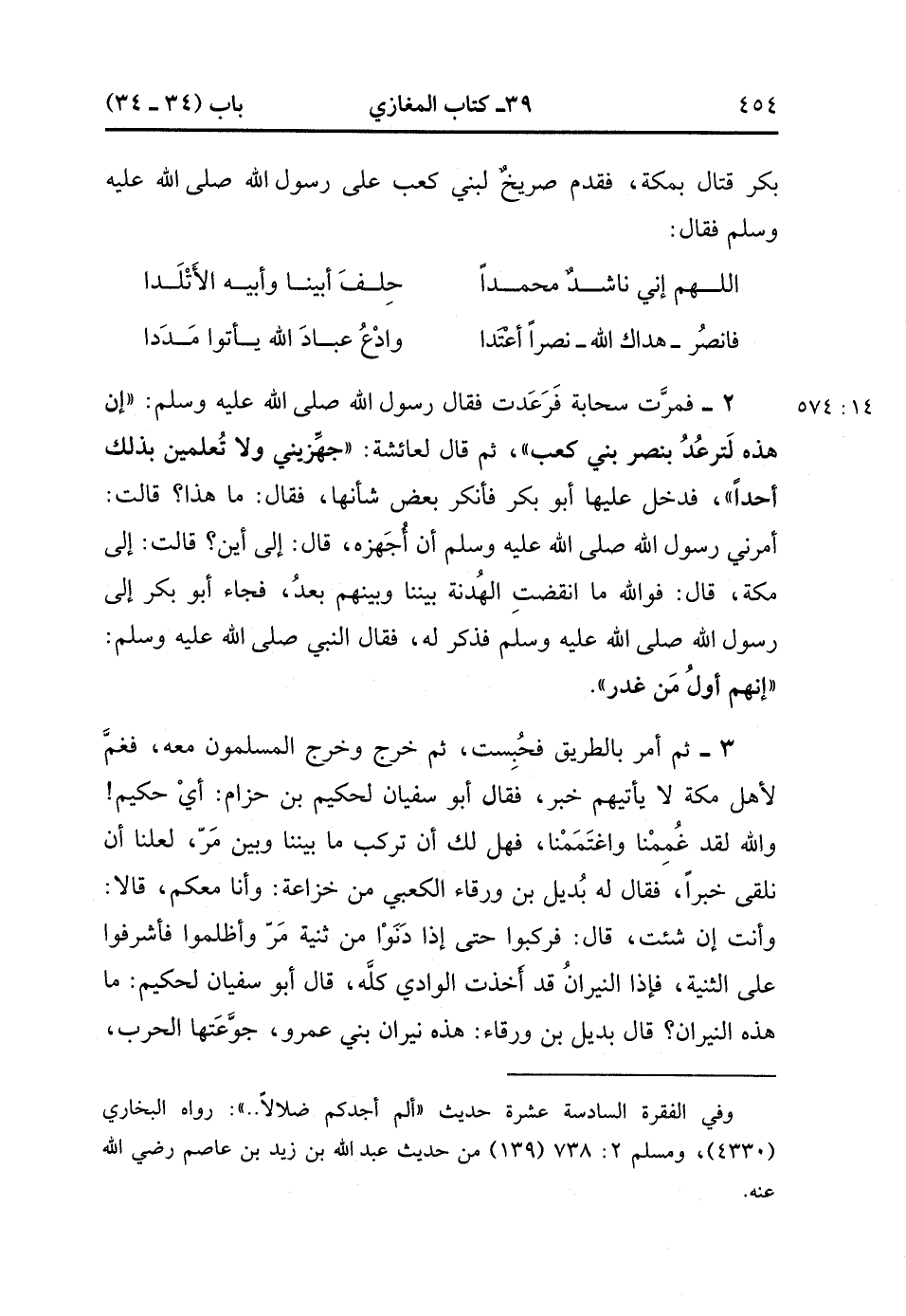 وَمِقْيَسَ بْنَ صُبَابَةَ اللَّيْثِيَّ ، وَعَبْدَ اللهِ بْنَ سَعْدِ بْنِ أَبِي سَرْحٍ ، وَالْقَيْنَتَيْنِ ، فَإِنْ وَجَدْتُمُوهُمْ مُتَعَلِّقِينَ بِأَسْتَارِ الْكَعْبَةِ فَاقْتُلُوهُمْ ، قَالَ : فَلَمَّا وَلَّوْا ، قَالَ أَبُو بَكْرٍ : يَا رَسُولَ اللهِ ، لَوْ أَمَرْت بِأَبِي سُفْيَانَ فَحَبَسَ عَلَى الطَّرِيقِ ، وَأَذَّنَ فِي النَّاسِ بِالرَّحِيلِ ، فَأَدْرَكَهُ الْعَبَّاسُ ، فَقَالَ : هَلْ لَك إِلَى أَنْ تَجْلِسَ حَتَّى تَنْظُرَ ؟ قَالَ : بَلَى ، وَلَمْ يَكُنْ ذَلِكَ إِلاَّ لِيَرَى ضَعْفَةً فَيَسْأَلَهُمْ ، فَمَرَّتْ جُهَيْنَةُ ، فَقَالَ : أَيْ عَبَّاسُ ، مَنْ هَؤُلاَءِ ؟ قَالَ : هَذِهِ جُهَيْنَةُ ، قَالَ : مَا لِي وَلِجُهَيْنَةَ ؟ وَاللهِ مَا كَانَتْ بَيْنِي وَبَيْنَهُمْ حَرْبٌ قَطُّ ، ثُمَّ مَرَّتْ مُزَيْنَةُ ، فَقَالَ : أَيْ عَبَّاسُ ، مَنْ هَؤُلاَءِ ؟ قَالَ : هَذِهِ مُزَيْنَةُ ، قَالَ : مَا لِي وَلِمُزَيْنَةَ ، وَاللهِ مَا كَانَتْ بَيْنِي وَبَيْنَهُمْ حَرْبٌ قَطُّ ، ثُمَّ مَرَّتْ سُلَيْمٌ ، فَقَالَ : أَيْ عَبَّاسُ ، (14/475) مَنْ هَؤُلاَءِ ؟ قَالَ : هَذِهِ سُلَيْمٌ ، قَالَ : ثُمَّ جَعَلَتْ تَمُرُّ طَوَائِفُ الْعَرَبِ ، فَمَرَّتْ عَلَيْهِ أَسْلَمُ وَغِفَارٌ فَيَسْأَلُ عَنْهَا فَيُخْبِرُهُ الْعَبَّاسُ.