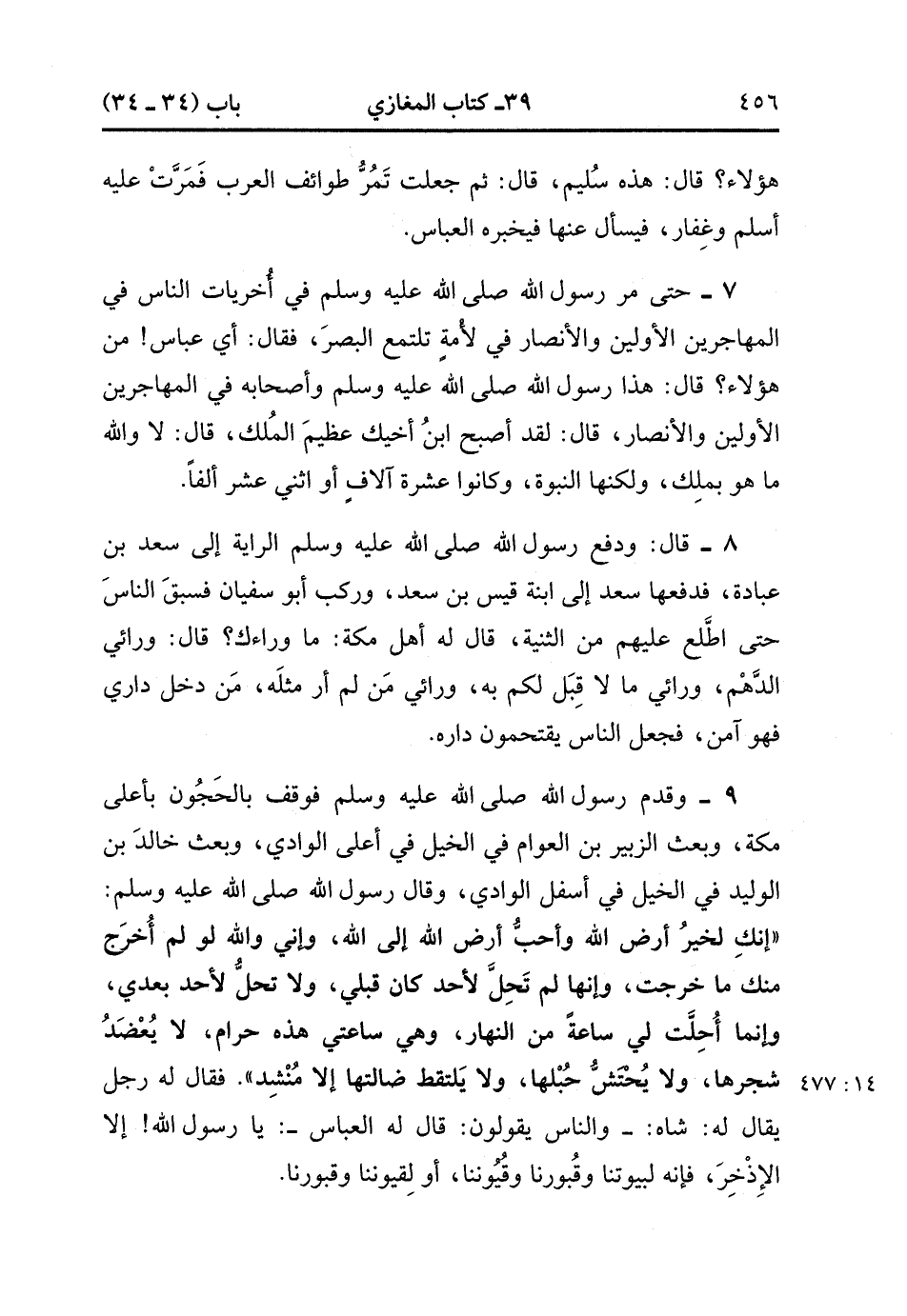 ثُمَّ طَافَ رَسُولُ اللهِ صَلَّى الله عَلَيْهِ وَسَلَّمَ بِالْبَيْتِ ، ثُمَّ دَخَلَ عُثْمَانُ بْنُ طَلْحَةَ ، فَقَالَ : أَيْ عُثْمَان ، أَيْنَ الْمِفْتَاحُ ؟ فَقَالَ : هُوَعِنْدَ أُمِّي سُلاَفَةَ ابْنَةِ سَعْدٍ ، فَأَرْسَلَ إِلَيْهَا رَسُولُ اللهِ صَلَّى الله عَلَيْهِ وَسَلَّمَ ، فَقَالَتْ : لاَ وَاللاَتِ وَالْعُزَّى ، لاَ أَدْفَعُهُ إِلَيْهِ أَبَدًا ، قَالَ : إِنَّهُ قَدْ جَاءَ أَمْرٌ غَيْرُ الأَمْرِ الَّذِي كُنَّا عَلَيْهِ ، فَإِنَّك إِنْ لَمْ تَفْعَلِي قُتِلْتُ أَنَا وَأَخِي ، قَالَ : فَدَفَعَتْهُ إِلَيْهِ ، قَالَ : فَأَقْبَلَ بِهِ حَتَّى إِذَا كَانَ وِجَاهَ رَسُولِ اللهِ صَلَّى الله عَلَيْهِ وَسَلَّمَ ، عُثِرَ فَسَقَطَ الْمِفْتَاحُ مِنْهُ ، فَقَامَ إِلَيْهِ رَسُولُ اللهِ صَلَّى الله عَلَيْهِ وَسَلَّمَ فَأَحْنَى عَلَيْهِ ثَوْبَهُ ، ثُمَّ فَتْحَ لَهُ عُثْمَان ، فَدَخَلَ رَسُولُ اللهِ صَلَّى الله عَلَيْهِ وَسَلَّمَ الْكَعْبَةَ ، فَكَبَّرَ فِي زَوَايَاهَا وَأَرْجَائِهَا ، وَحَمِدَ اللَّهَ ، ثُمَّ صَلَّى بَيْنَ الأُسْطُوَانَتَيْنِ رَكْعَتَيْنِ ، ثُمَّ خَرَجَ فَقَامَ بَيْنَ الْبَابَيْنِ ، (14/477) فَقَالَ عَلِيٌّ : فَتَطَاوَلْت لَهَا وَرَجَوْت أَنْ يَدْفَعَ إِلَيْنَا الْمِفْتَاحَ ، فَتَكُونُ فِينَا السِّقَايَةُ وَالْحِجَابَةُ ، فَقَالَ رَسُولُ اللهِ صَلَّى الله عَلَيْهِ وَسَلَّمَ : أَيْنَ عُثْمَان ؟ هَاكُمْ مَا أَعْطَاكُمُ اللَّهُ ، فَدَفَعَ إِلَيْهِ الْمِفْتَاحَ. (14/478).