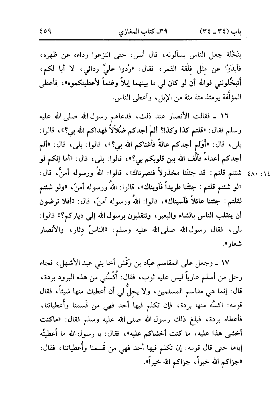 فَقَالَتِ الأَنْصَارُ عِنْدَ ذَلِكَ ، فَدَعَاهُمْ رَسُولُ اللهِ صَلَّى الله عَلَيْهِ وَسَلَّمَ ، فَقَالَ : قُلْتُمْ كَذَا وَكَذَا ؟ أَلَمْ أَجِدْكُمْ ضُلاَّلاً فَهَدَاكُمُ اللَّهُ بِي ؟ قَالَوا : بَلَى ، قَالَ : أَوَلَمْ أَجِدْكُمْ عَالةً فَأَغْنَاكُمْ اللَّهُ بَي ؟ قَالُوا : بَلَى ، قَالَ : أَلَمْ أَجِدْكُمْ أَعْدَاءً فَأَلَّفَ اللَّهُ بَيْنَ قُلُوبِكُمْ بِي ؟ قَالَوا : بَلَى ، قَالَ : أَمَا إِنَّكُمْ لَوْ شِئْتُمْ قُلْتُمْ : قَدْ جِئْتَنَا مَخْذُولاً فَنَصَرْنَاك ، (14/479) قَالَوا : اللَّهُ وَرَسُولُهُ أَمَنَّ ، قَالَ : لَوْ شِئْتُمْ قُلْتُمْ : جِئْتَنَا طَرِيدًا فَآوَيْنَاك ، قَالَوا : اللَّهُ وَرَسُولُهُ أَمَنَّ ، وَلَوْ شِئْتُمْ لَقُلْتُمْ : جِئْتنَا عَائِلاً فَآسَيْنَاك ، قَالَوا : اللَّهُ وَرَسُولُهُ أَمَنَّ ، قَالَ : أَفَلاَ تَرْضَوْنَ أَنْ يَنْقَلِبَ النَّاسُ بِالشَّاءِ وَالْبَعِيرِ ، وَتَنْقَلِبُونَ بِرَسُولِ اللهِ إِلَى دِيَارِكُمْ ؟ قَالَوا : بَلَى ، فَقَالَ رَسُولُ اللهِ صَلَّى الله عَلَيْهِ وَسَلَّمَ : النَّاسُ دِثَارٌ ، وَالأَنْصَارُ شِعَارٌ.