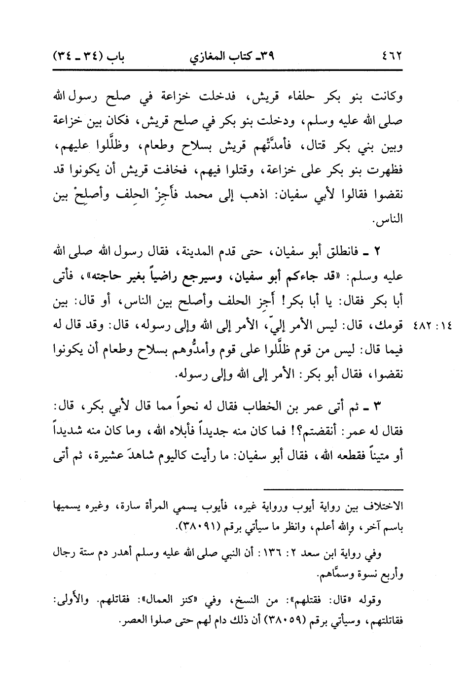 ثُمَّ أَتَى عُمَرَ بْنَ الْخَطَّابِ ، فَقَالَ لَهُ نَحْوًا مِمَا قَالَ لأَبِي بَكْرٍ ، قَالَ : فَقَالَ لَهُ عُمَرُ : أَنَقَضْتُمْ ؟ فَمَا كَانَ مِنْهُ جَدِيدًا فَأَبْلاَهُ اللَّهُ ، وَمَا كَانَ مِنْهُ شَدِيدًا ، أَوْ مَتِينًا فَقَطَعَهُ اللَّهُ ، فَقَالَ أَبُو سُفْيَانَ : مَا رَأَيْتُ كَالْيَوْمِ شَاهِدَ عَشِيرَةٍ ، ثُمَّ أَتَى فَاطِمَةَ ، فَقَالَ : يَا فَاطِمَةُ ، هَلْ لَك فِي أَمْرٍ تَسُودِينَ فِيهِ نِسَاءَ قَوْمِكَ ، ثُمَّ ذَكَرَ لَهَا نَحْوًا مِمَاْ ذَكَرَ لأَبِي بَكْرٍ ، فَقَالَتْ : لَيْسَ الأَمْرُ إِلَي ، الأَمْرُ إِلَى اللهِ (14/481) وَإِلَى رَسُولِهِ ، ثُمَّ أَتَى عَلِيًّا ، فَقَالَ لَهُ نَحْوًا مِمَا قَالَ لأَبِي بَكْرٍ ، فَقَالَ لَهُ عَلِيٌّ : مَا رَأَيْتُ كَالْيَوْمِ رَجُلاً أَضَلَّ ، أَنْتَ سَيِّدُ النَّاسِ ، فَأَجِزْ الْحِلْفَ وَأَصْلِحْ بَيْنَ النَّاسِ ، قَالَ : فَضَرَبَ إِحْدَى يَدَيْهِ عَلَى الأُخْرَى ، وَقَالَ : قَدْ أَجْرَتُ النَّاسَ بَعْضُهُمْ مِنْ بَعْضٍ.