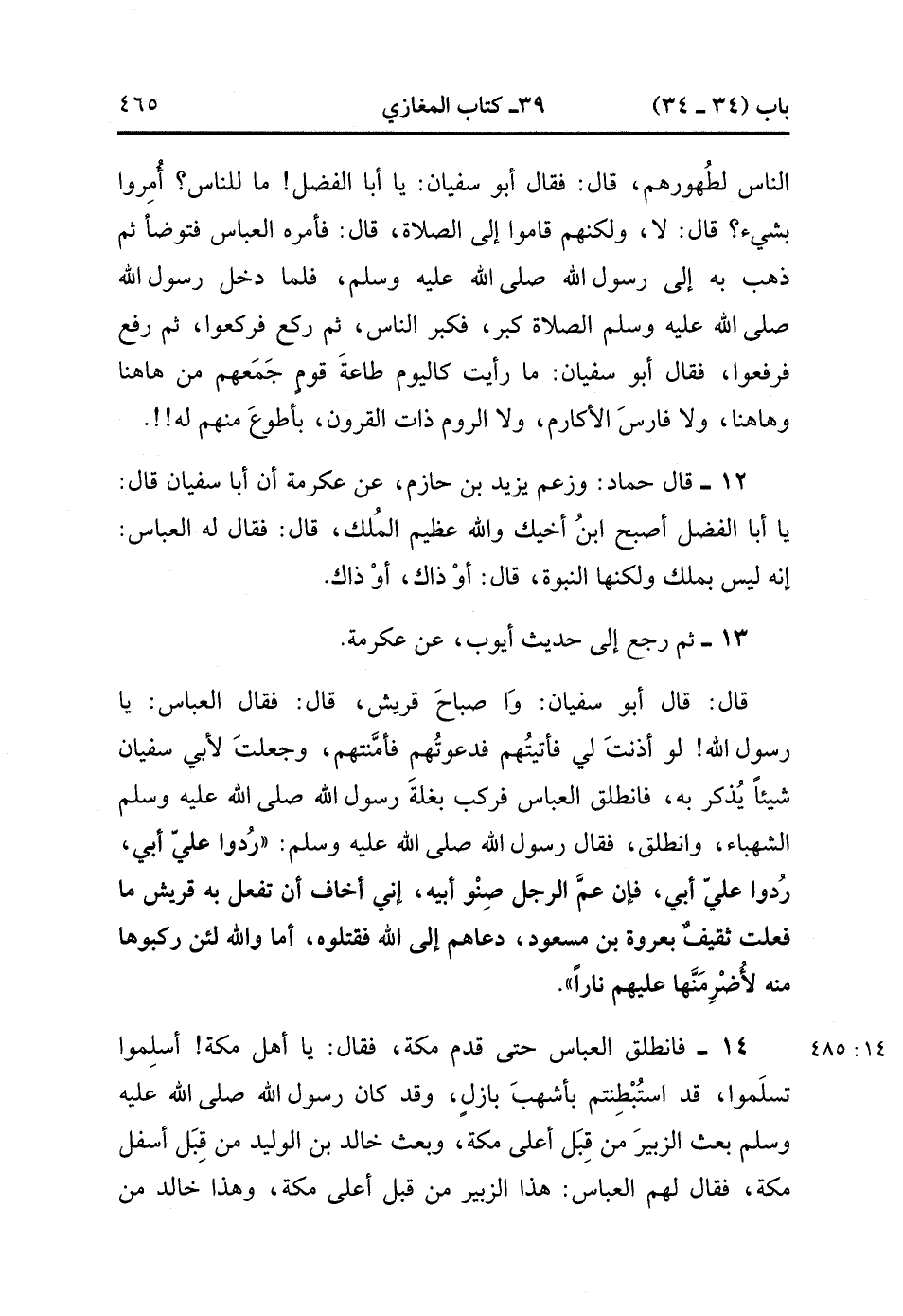 قَالَ : قَالَ أَبُو سُفْيَانَ : وَاصَبَاحَ قُرَيْشٍ ، قَالَ : فَقَالَ الْعَبَّاسُ : يَا رَسُولَ اللهِ ، لَوْ أَذِنْتَ لِي فَأَتَيْتُهُمْ ، فَدَعَوْتُهُمْ ، فَأَمَّنْتُهُمْ ، وَجَعَلْتَ لأَبِي سُفْيَانَ شَيْئًا يُذْكَرُ بِهِ ، فَانْطَلَقَ الْعَبَّاسُ ، فَرَكِبَ بَغْلَةَ رَسُولِ اللهِ صَلَّى الله عَلَيْهِ وَسَلَّمَ الشَّهْبَاءَ وَانْطَلَقَ ، فَقَالَ رَسُولُ اللهِ صَلَّى الله عَلَيْهِ وَسَلَّمَ : رُدُّوا عَلَيَّ أَبِي ، رُدُّوا عَلَيَّ أَبِي ، فَإِنَّ عَمَّ الرَّجُلِ صِنْوُ أَبِيهِ ، إِنِّي أَخَافُ أَنْ تَفْعَلَ بِهِ قُرَيْشٌ مَا فَعَلَتْ ثَقِيفٌ بِعُرْوَةِ بْنِ مَسْعُودٍ ،(14/484).