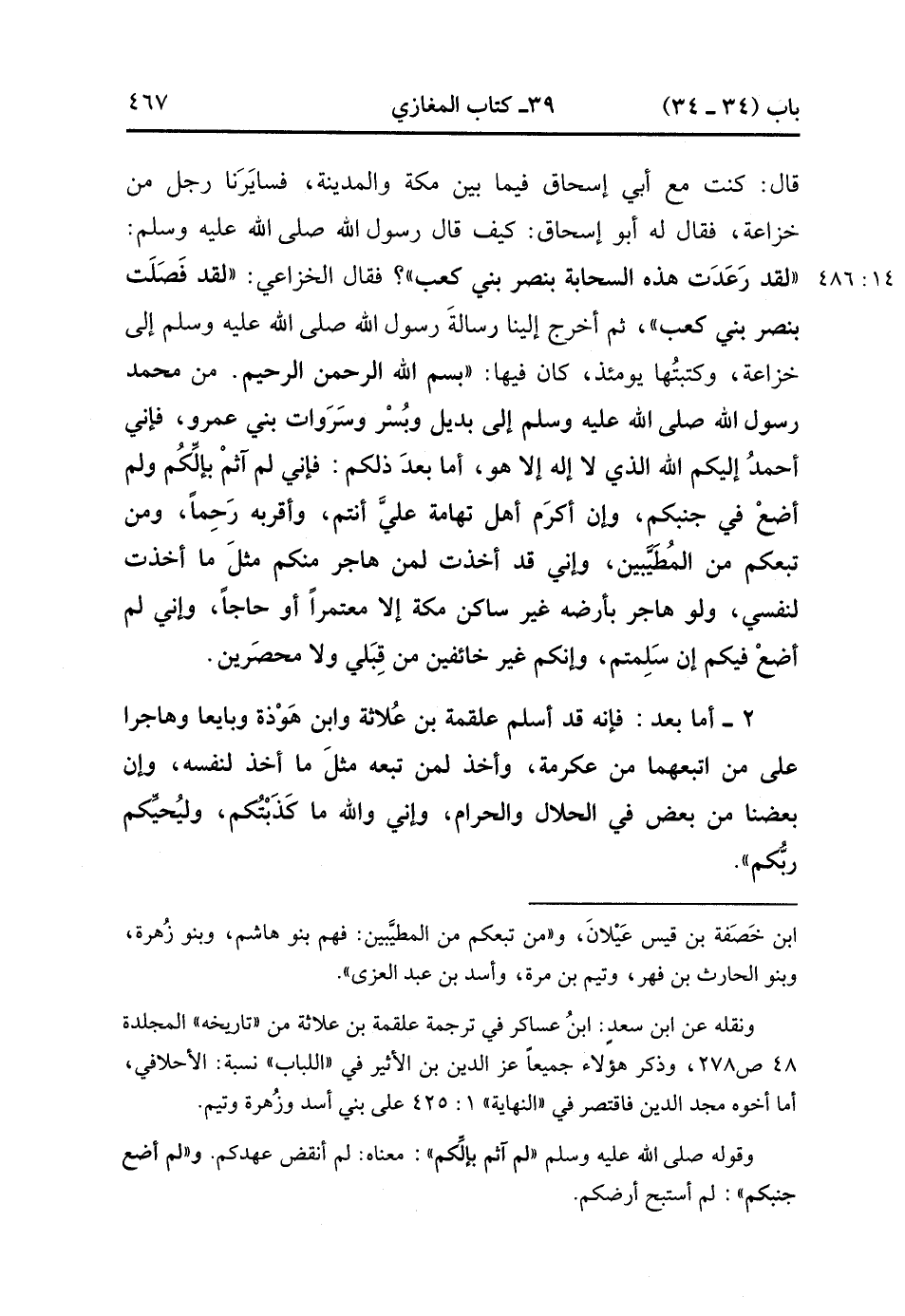 38058- حَدَّثَنَا عَبْدُ الرَّحِيمِ بْنُ سُلَيْمَانَ ، عَنْ زَكَرِيَّا بْنِ أَبِي زَائِدَةَ ، قَالَ : كُنْتُ مَعَ أَبِي إِسْحَاقَ فِيمَا بَيْنَ مَكَّةَ وَالْمَدِينَةِ ، فَسَايَرَنَا رَجُلٌ مِنْ خُزَاعَةَ ، فَقَالَ لَهُ أَبُو إِسْحَاقَ : كَيْفَ قَالَ رَسُولُ اللهِ صَلَّى الله عَلَيْهِ وَسَلَّمَ : لَقَدْ رَعَدَتْ (14/485) هَذِهِ السَّحَابَةُ بِنَصْرِ بَنِي كَعْبٍ ؟ فَقَالَ الْخُزَاعِيُّ : لَقَدْ فَصَلَتْ بِنَصْرِ بَنِي كَعْبٍ ، ثُمَّ أَخْرَجَ إِلَيْنَا رِسَالَةَ رَسُولِ اللهِ صَلَّى الله عَلَيْهِ وَسَلَّمَ إِلَى خُزَاعَةَ ، وَكَتَبْتُهَا يَوْمَئِذٍ ، كَانَ فِيهَا : بِسْمِ اللهِ الرَّحْمَن الرَّحِيمِ ، مِنْ مُحَمَّدٍ رَسُولِ اللهِ صَلَّى الله عَلَيْهِ وَسَلَّمَ إِلَى بُدَيْلٍ ، وَبُسْرٍ ، وَسَرَوَاتِ بَنِي عَمْرٍو ، فَإِنِّي أَحْمَدُ إِلَيْكُمُ اللَّهَ ، الَّذِي لاَ إِلَهَ إِلاَّ هُوَ ، أَمَّا بَعْدَ ذَلِكُمْ : فَإِنِّي لَمْ آثَمْ بَإِلَّكُمْ ، وَلَمْ أَضَعْ فِي جَنْبِكُمْ ، وَإِنَّ أَكْرَمَ أَهْلِ تِهَامَةَ عَلَيَّ أَنْتُمْ ، وَأَقْرَبَهُ رَحِمًا ، وَمَنْ تَبِعَكُمْ مِنَ الْمُطَيَّبِينَ ، وَإِنِّي قَدْ أَخَذْتُ لِمَنْ هَاجَرَ مِنْكُمْ مِثْلَ مَا أَخَذْتُ لِنَفْسِي ،(14/486).