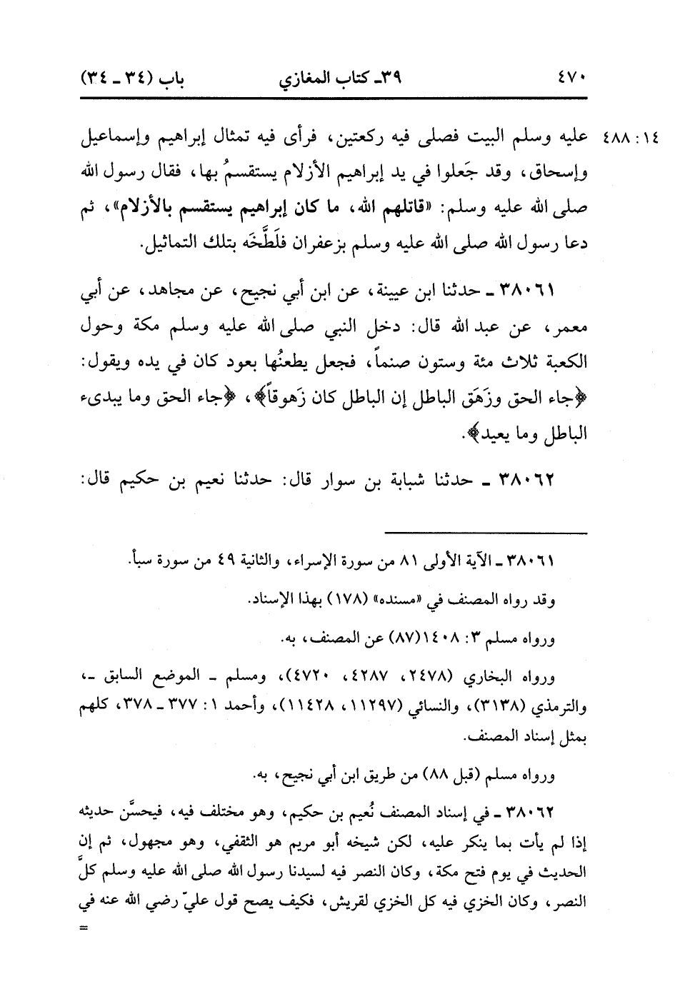 38061- حَدَّثَنَا ابْنُ عُيَيْنَةَ ، عَنِ ابْنِ أَبِي نَجِيحٍ ، عَنْ مُجَاهِدٍ ، عَنْ أَبِي مَعْمَرٍ ، عَنْ عَبْدِ اللهِ ، قَالَ : دَخَلَ النَّبِيُّ صَلَّى الله عَلَيْهِ وَسَلَّمَ مَكَّةَ ، وَحَوْلَ الْكَعْبَةِ ثَلاَثُ مِئَةٍ وَسِتُّونَ صَنَمًا ، فَجَعَلَ يَطْعَنُهَا بِعُودٍ كَانَ فِي يَدِهِ ، وَيَقُولُ : {جَاءَ الْحَقُّ وَزَهَقَ الْبَاطِلُ ، إِنَّ الْبَاطِلَ كَانَ زَهُوقًا} {جَاءَ الْحَقُّ ، وَمَا يُبْدِئُ الْبَاطِلُ وَمَا يُعِيدُ}.(14/488).