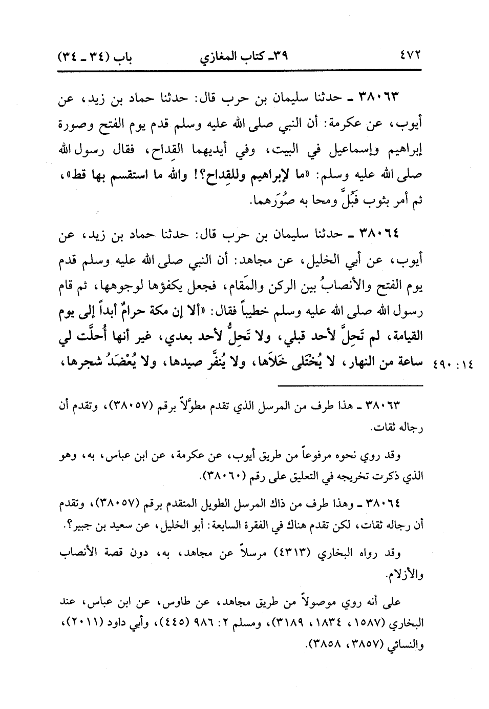 38064- حَدَّثَنَا سُلَيْمَانُ بْنُ حَرْبٍ , قَالَ : حدَّثَنَا حَمَّادُ بْنُ زَيْدٍ ، عَنْ أَيُّوبَ ، عَنْ أَبِي الْخَلِيلِ ، عَنْ مُجَاهِدٍ ؛ أَنَّ النَّبِيَّ صَلَّى الله عَلَيْهِ وَسَلَّمَ قَدِمَ يَوْمَ الْفَتْحِ وَالأَنْصَابُ بَيْنَ الرُّكْنِ وَالْمَقَامِ ، فَجَعَلَ يُكَفؤهَا لِوُجُوهِهَا ، ثُمَّ قَامَ رَسُولُ اللهِ صَلَّى الله عَلَيْهِ وَسَلَّمَ خَطِيبًا ، فَقَالَ : أَلاَ إِنَّ مَكَّةَ حَرَامٌ أَبَدًا إِلَى يَوْمِ الْقِيَامَةِ ، لَمْ تَحِلَّ لأَحَدٍ قَبْلِي ، وَلاَ تَحِلُّ لأَحَدٍ بَعْدِي ، غَيْرَ أَنَّهَا أُحِلَّتْ لِي سَاعَةً مِنَ (14/489) النَّهَارِ ، لاَ يُخْتَلَى خَلاَهَا ، وَلاَ يُنَفَّرُ صَيْدُهَا ، وَلاَ يُعْضَدُ شَجَرُهَا ، وَلاَ تُلْتَقَطُ لُقَطَتُهَا إِلاَّ أَنْ تُعَرَّفَ ، فَقَامَ الْعَبَّاسُ ، فَقَالَ : يَا رَسُولَ اللهِ ، إِلاَّ الإِذْخِرَ ، لِصَاعَتِنَا وَبُيُوتِنَا وَقُبُورِنَا ، فَقَالَ : إِلاَّ الإِذْخِرَ ، إِلاَّ الإِذْخِرَ. (14/490).