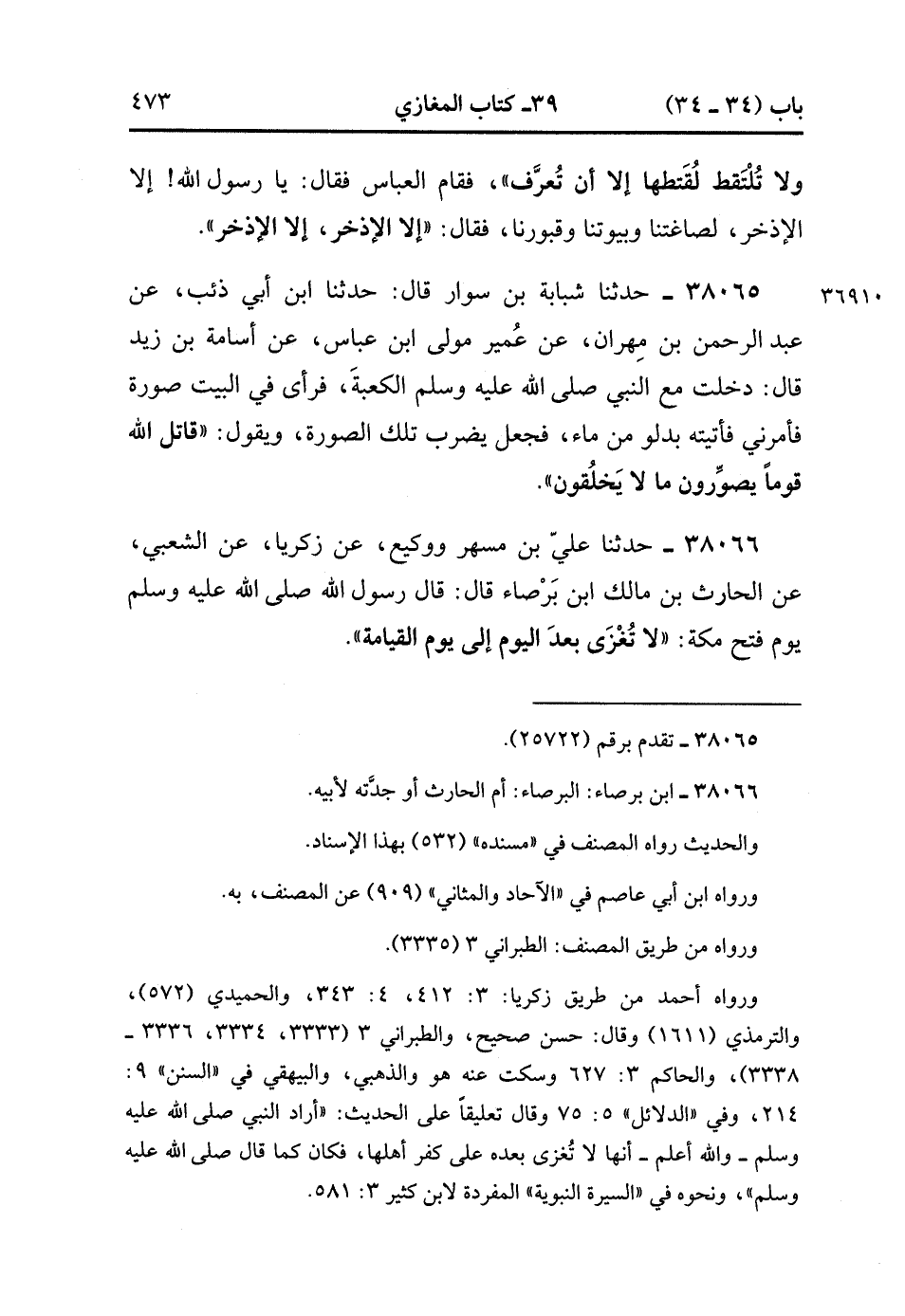 38066- حَدَّثَنَا عَلِيُّ بْنُ مُسْهِرٍ ، وَوَكِيعٌ ، عَنْ زَكَرِيَّا ، عَنِ الشَّعْبِيِّ ، عَنِ الْحَارِثِ بْنِ مَالِكِ بْنِ بَرْصَاءَ ، قَالَ : قَالَ رَسُولُ اللهِ صَلَّى الله عَلَيْهِ وَسَلَّمَ يَوْمَ فَتْحِ مَكَّةَ : لاَ تُغْزَى بَعْدَ الْيَوْمِ إِلَى يَوْمِ الْقِيَامَةِ. (14/490).