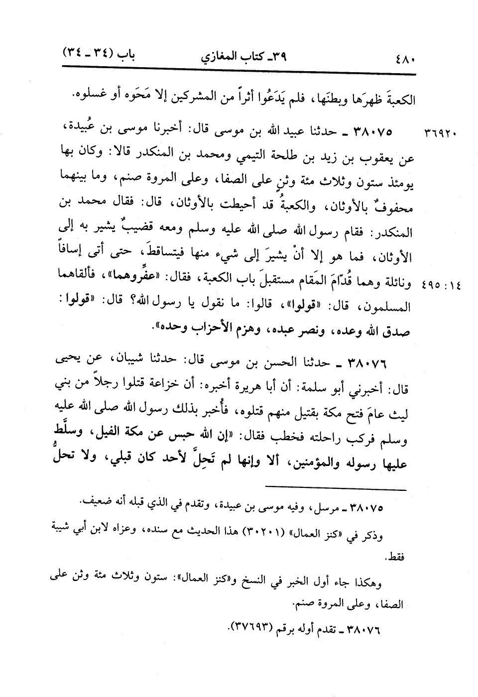 38075- حَدَّثَنَا عُبَيْدُ اللهِ بْنُ مُوسَى , قَالَ : أَخْبَرَنَا مُوسَى بْنُ عُبَيْدَةَ ، عَنْ يَعْقُوبَ بْنِ زَيْدِ بْنِ طَلْحَةَ التَّيْمِيِّ ، وَمُحَمَّدِ بْنِ الْمُنْكَدِرِ ، قَالاَ : وَكَانَ بِهَا يَوْمَئِذٍ سِتُّونَ وَثَلاَثُ مِئَة وَثَنٍ عَلَى الصَّفَا ، وَعَلَى الْمَرْوَةِ صَنَمٌ ، وَمَا بَيْنَهُمَا مَحْفُوفٌ بِالأَوْثَانِ ، وَالْكَعْبَةُ قَدْ أُحِيطَتْ بِالأَوْثَانِ ، قَالَ : فَقَالَ مُحَمَّدُ بْنُ الْمُنْكَدِرِ : فَقَامَ رَسُولُ اللهِ صَلَّى الله عَلَيْهِ وَسَلَّمَ وَمَعَهُ قَضِيبٌ يُشِيرُ بِهِ إِلَى الأَوْثَانِ ، فَمَا هُوَ إِلاَّ أَنْ يُشِيرَ إِلَى شَيْءٍ مِنْهَا فَيَتَسَاقَطَ ، حَتَّى أَتَى إِسَافًا وَنَائِلَةَ ، وَهُمَا قُدَّامَ الْمَقَامِ ، مُسْتَقْبِلٌ بَابَ الْكَعْبَةِ ، فَقَالَ : عَفِّرُوهُمَا ، فَأَلْقَاهُمَا الْمُسْلِمُونَ ، قَالَ : قُولُوا ، قَالَوا : مَا نَقُولُ يَا رَسُولَ اللهِ ؟ قَالَ : قُولُوا : صَدَقَ اللَّهُ وَعْدَهُ ، وَنَصَرَ عَبْدَهُ ، وَهَزَمَ الأَحْزَابَ وَحْدَهُ. (14/494)