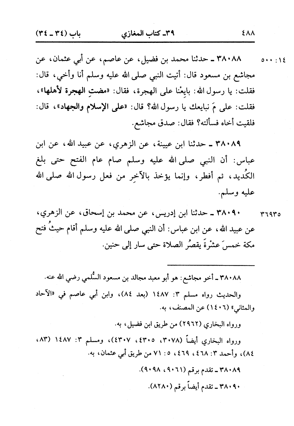 38088- حَدَّثَنَا مُحَمَّدُ بْنُ فُضَيْلٍ ، عَنْ عَاصِمٍ ، عَنْ أَبِي عُثْمَانَ ، عَنْ مُجَاشِعِ بْنِ مَسْعُودٍ ، قَالَ : أَتَيْتُ النَّبِيَّ صَلَّى الله عَلَيْهِ وَسَلَّمَ أَنَا وَأَخِي ، قَالَ : فَقُلْتُ : يَا رَسُولَ اللهِ : بَايِعْنَا عَلَى الْهِجْرَةِ ، فَقَالَ : مَضَتِ الْهِجْرَةُ لأَهْلِهَا ، فَقُلْتُ : عَلاَمَ نُبَايِعُك يَا رَسُولَ اللهِ ؟ قَالَ : عَلَى الإِسْلاَمِ وَالْجِهَادِ ، قَالَ : فَلَقِيتُ أَخَاهُ فَسَأَلْتُهُ ؟ فَقَالَ : صَدَقَ مُجَاشِعٌ.