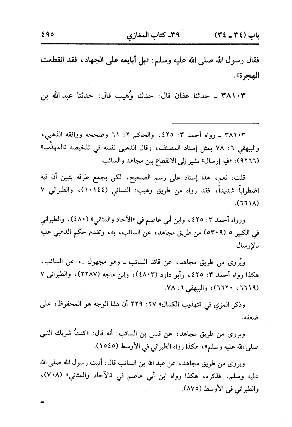38103- حَدَّثَنَا عَفَّانُ , قَالَ : حدَّثَنَا وُهَيْبٌ ، قَالَ : حَدَّثَنَا عَبْدُ اللهِ بْنُ عُثْمَانَ بْنِ خُثَيْمٍ ، عَنْ مُجَاهِدٍ ، عَنِ السَّائِبِ ؛ أَنَّهُ كَانَ يُشَارِكُ رَسُولَ اللهِ صَلَّى الله عَلَيْهِ وَسَلَّمَ قَبْلَ الإِسْلاَمِ فِي التِّجَارَةِ ، فَلَمَّا كَانَ يَوْمُ الْفَتْحِ أَتَاهُ ، فَقَالَ : مَرْحَبًا بِأَخِي وَشَرِيكِي كَانَ لاَ يُدَارِي ، وَلاَ يُمَارِي يَا سَائِبُ ، قَدْ كُنْت تَعْمَلُ أَعْمَالاً فِي الْجَاهِلِيَّةِ ، لاَ تُتَقَبَّلُ مِنْك ، وَهِيَ الْيَوْمُ تُتَقَبَّلُ مِنْك . وَكَانَ ذَا سَلَفٍ وَصِلَةٍ. (14/505).