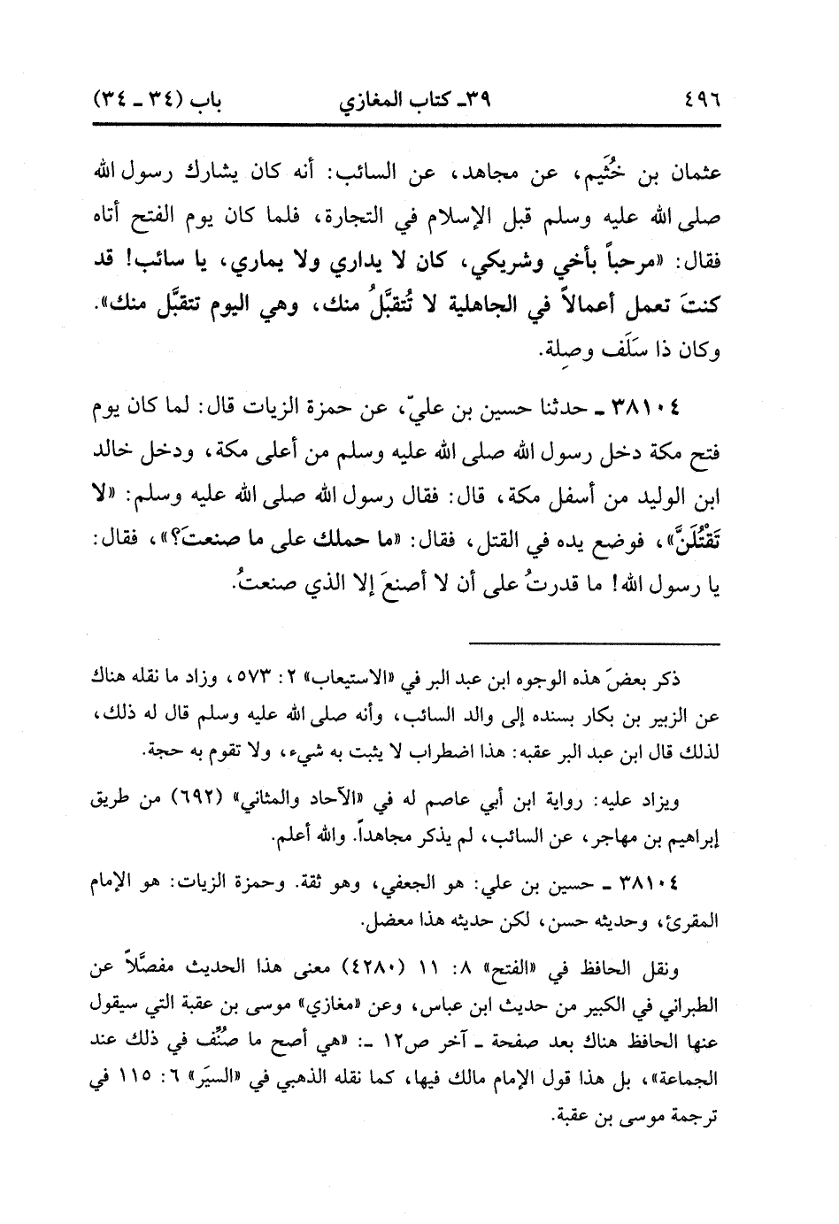 38104- حَدَّثَنَا حُسَيْنُ بْنُ عَلِيٍّ ، عَنْ حَمْزَةَ الزَّيَّاتِ ، قَالَ : لَمَّا كَانَ يَوْمُ فَتْحِ مَكَّةَ ، دَخَلَ رَسُولُ اللهِ صَلَّى الله عَلَيْهِ وَسَلَّمَ مِنْ أَعْلَى مَكَّةَ ، وَدَخَلَ خَالِدُ بْنُ الْوَلِيدِ مِنْ أَسْفَلِ مَكَّةَ ، قَالَ : فَقَالَ رَسُولُ اللهِ صَلَّى الله عَلَيْهِ وَسَلَّمَ : لاَ تَقْتُلَنَّ ، فَوَضَعَ يَدَهُ فِي الْقَتْلِ ، فَقَالَ : مَا حَمَلَك عَلَى مَا صَنَعْت ؟ فَقَالَ : يَا رَسُولَ اللهِ ، مَا قَدَرْتُ عَلَى أَنْ لاَ أَصْنَعَ إِلاَّ الَّذِي صَنَعْتُ. (14/505).